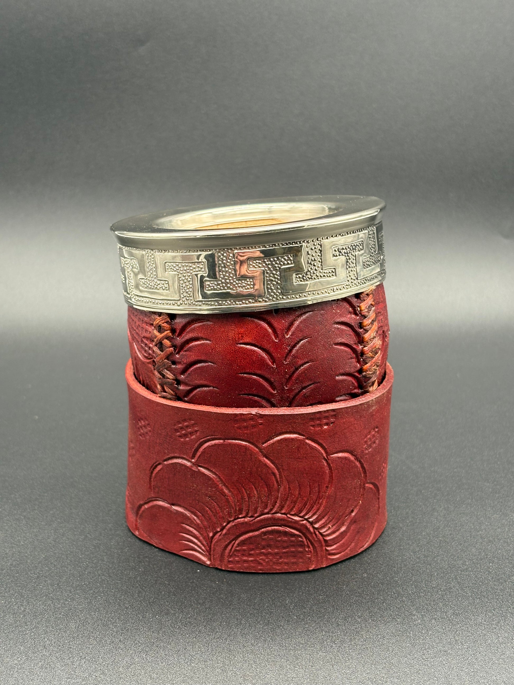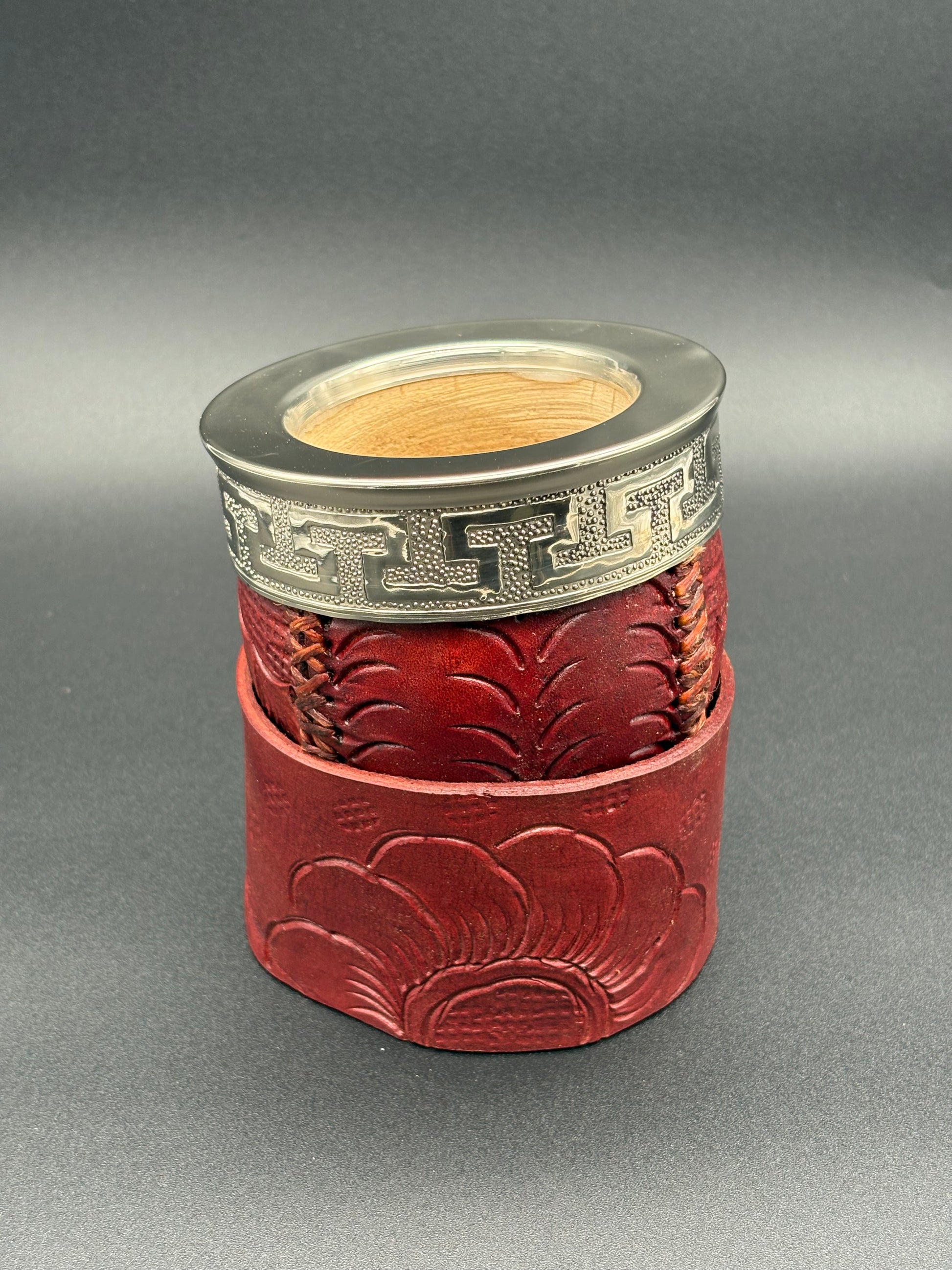 Imperial criollo con interior de calabaza, cuero repujado, virola de alpaca lisa y posa mate de cuero repujado.