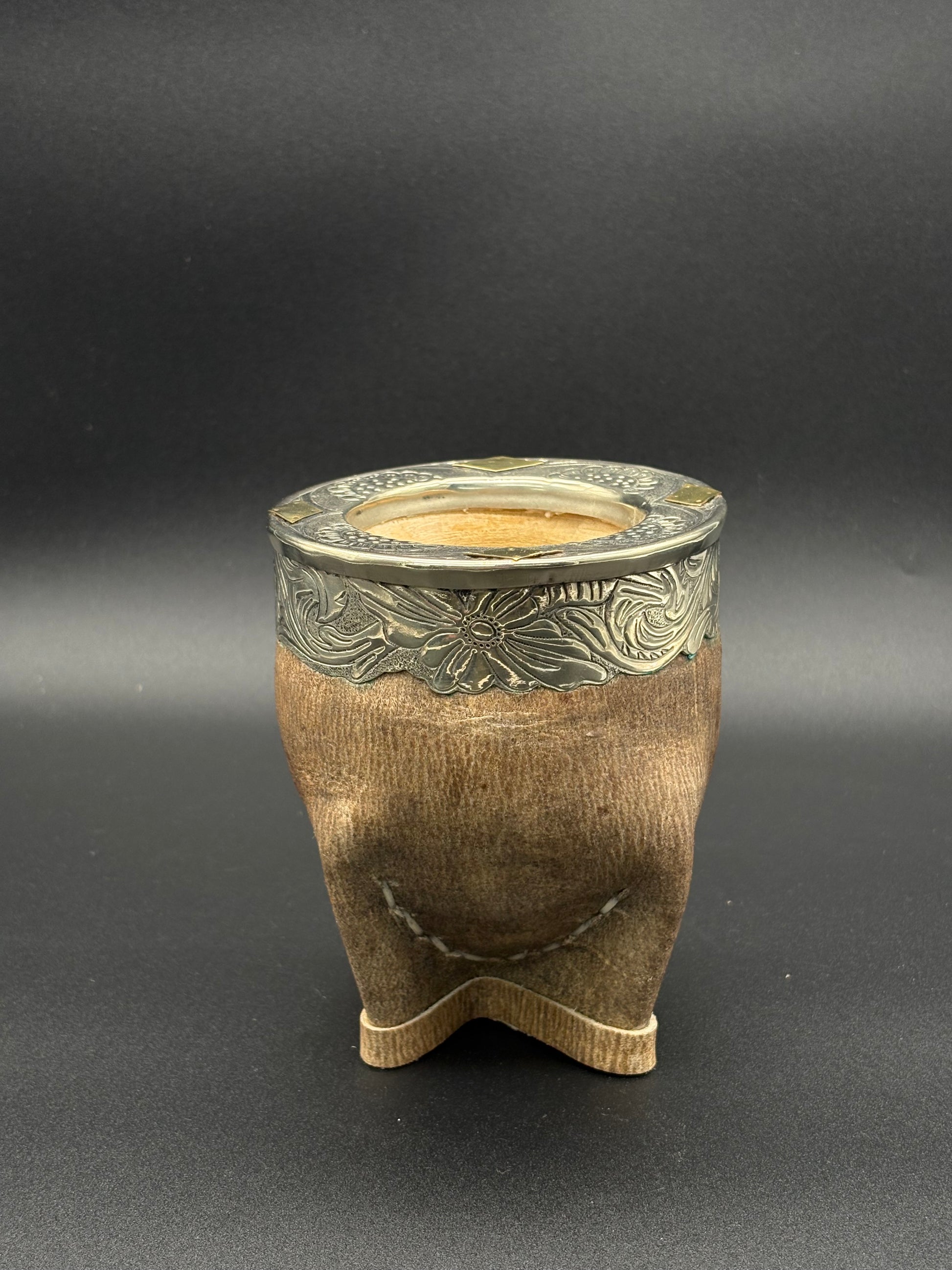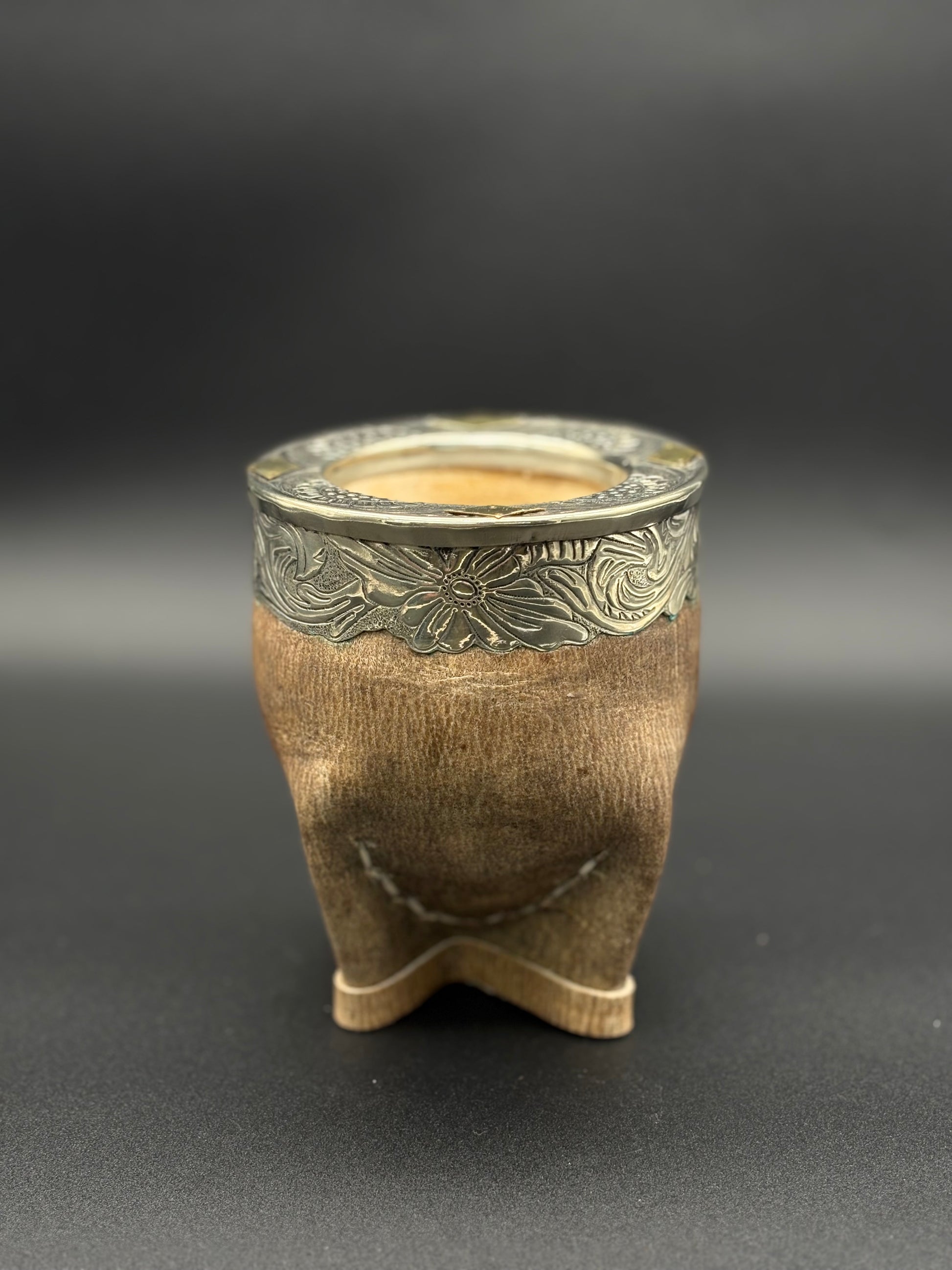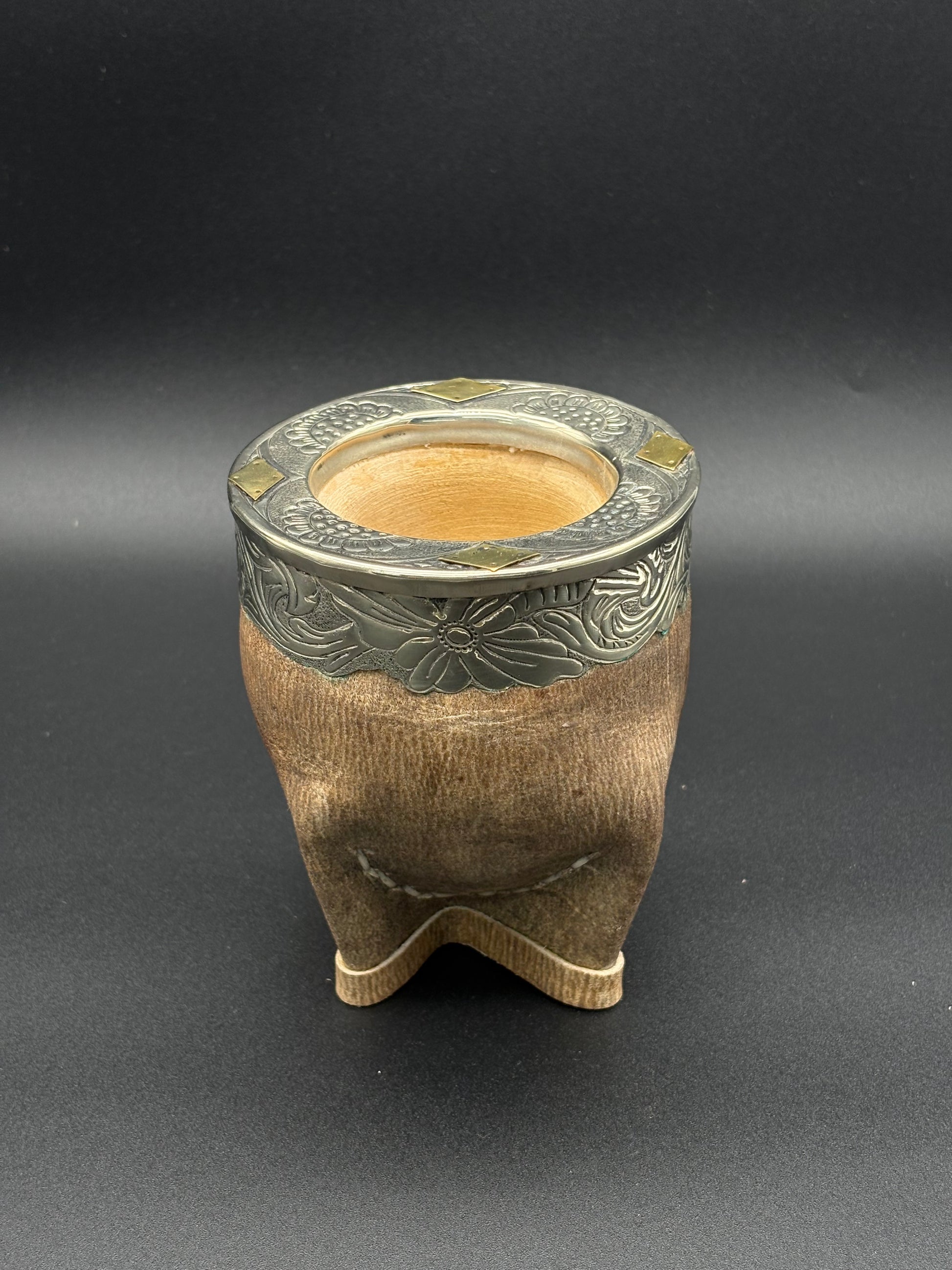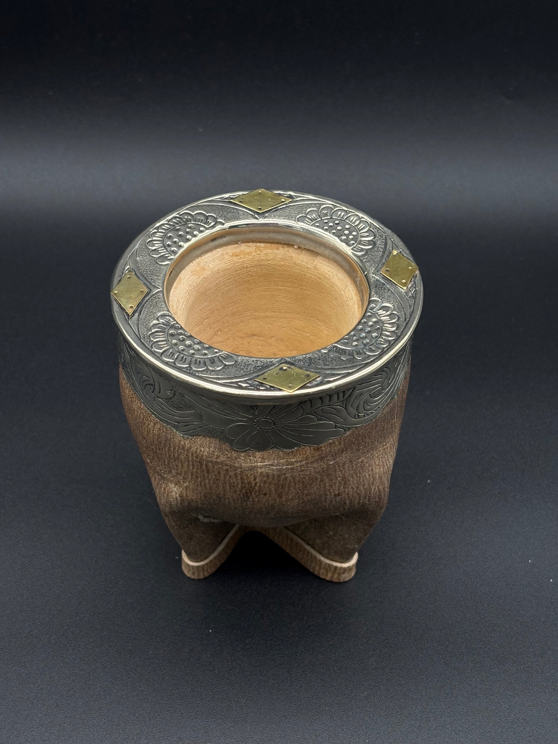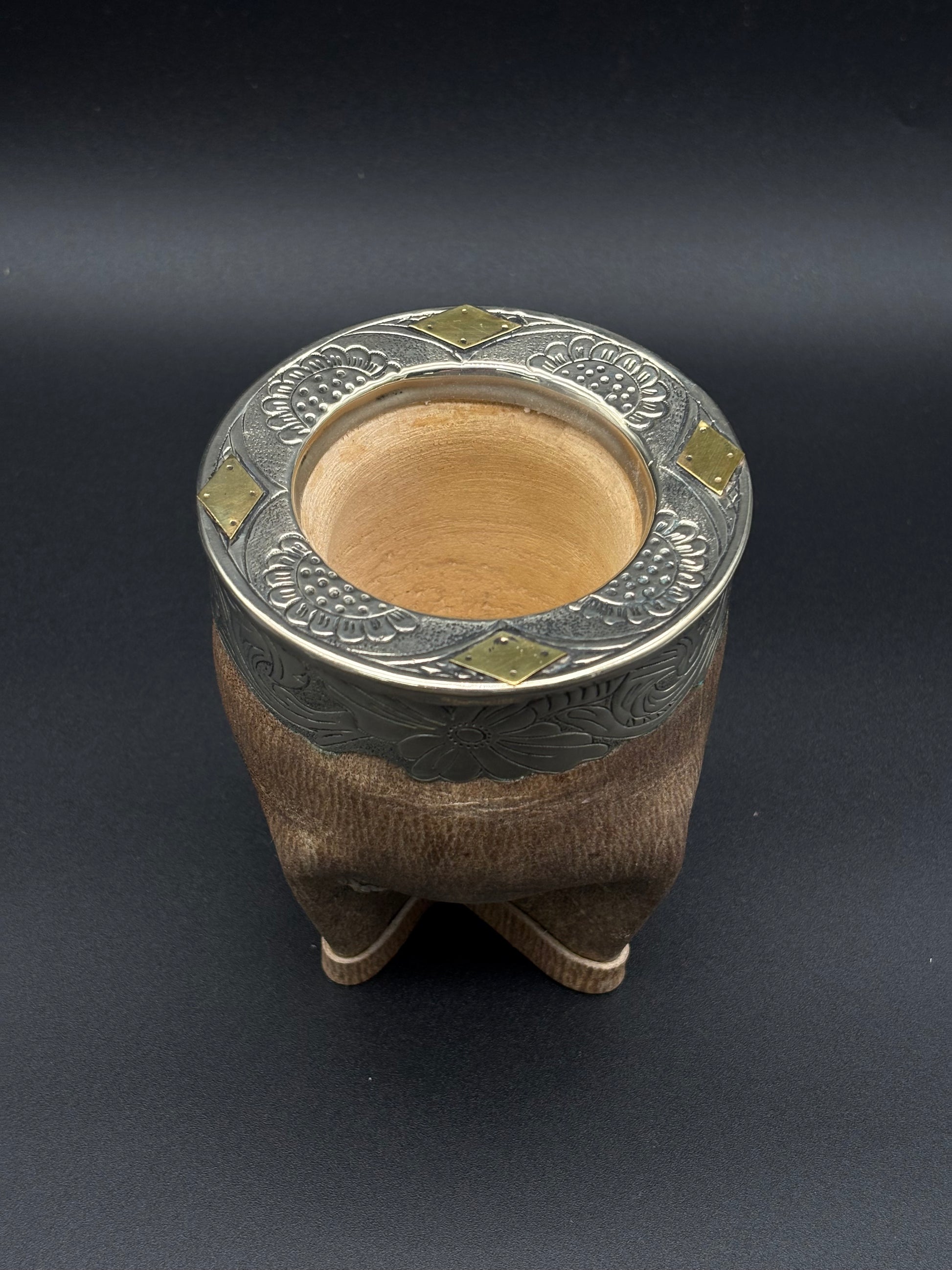 Calabaza brasilera seleccionada en cuero crudo, con virola cincelada al lacre y calada, más apliques en bronce que realzan su diseño artesanal. Un mate único, elegante y resistente 💪 ideal para quienes buscan distinción en cada cebada.
