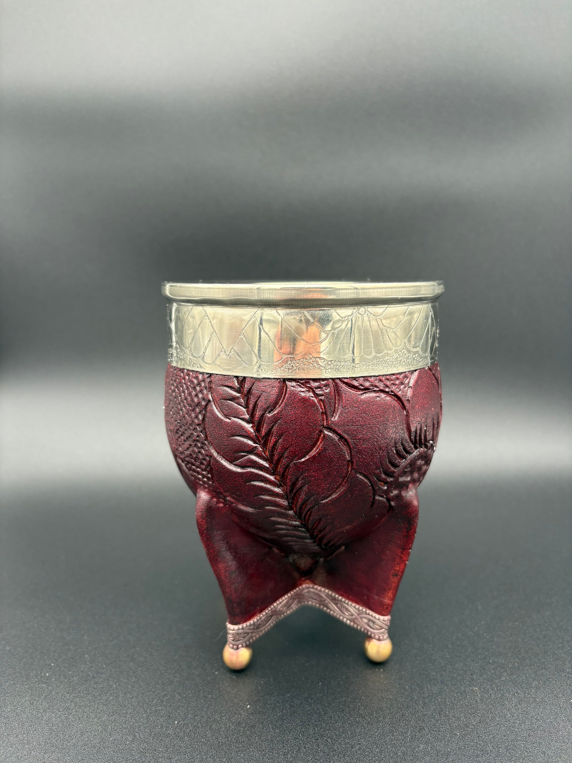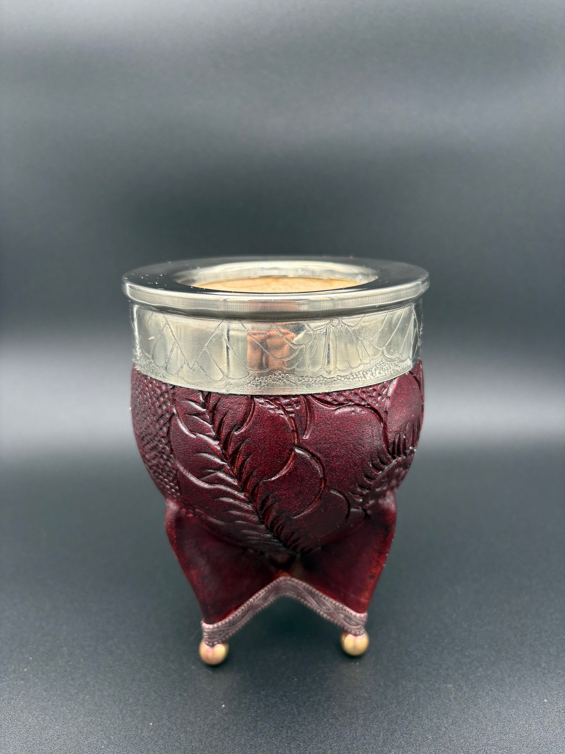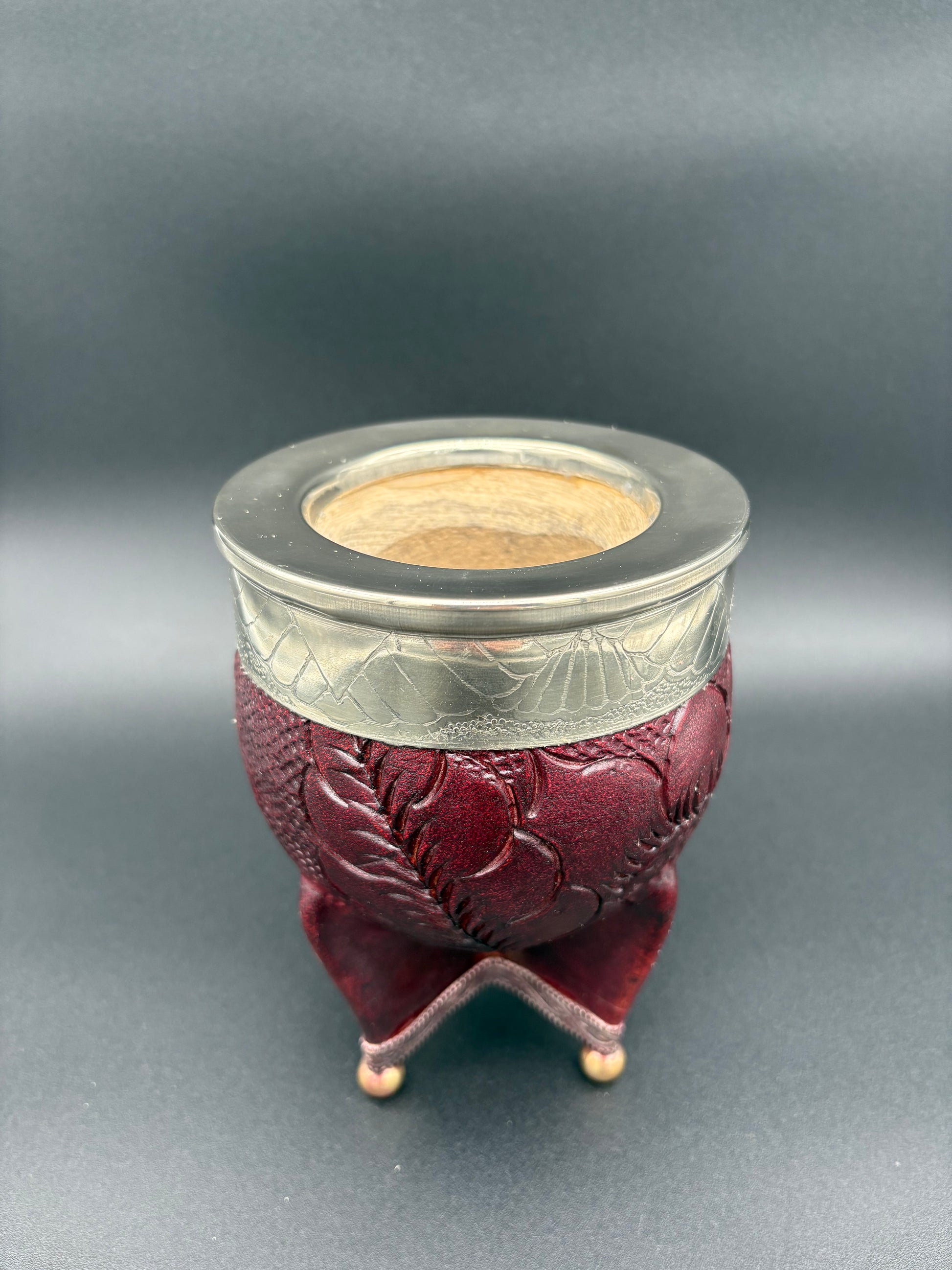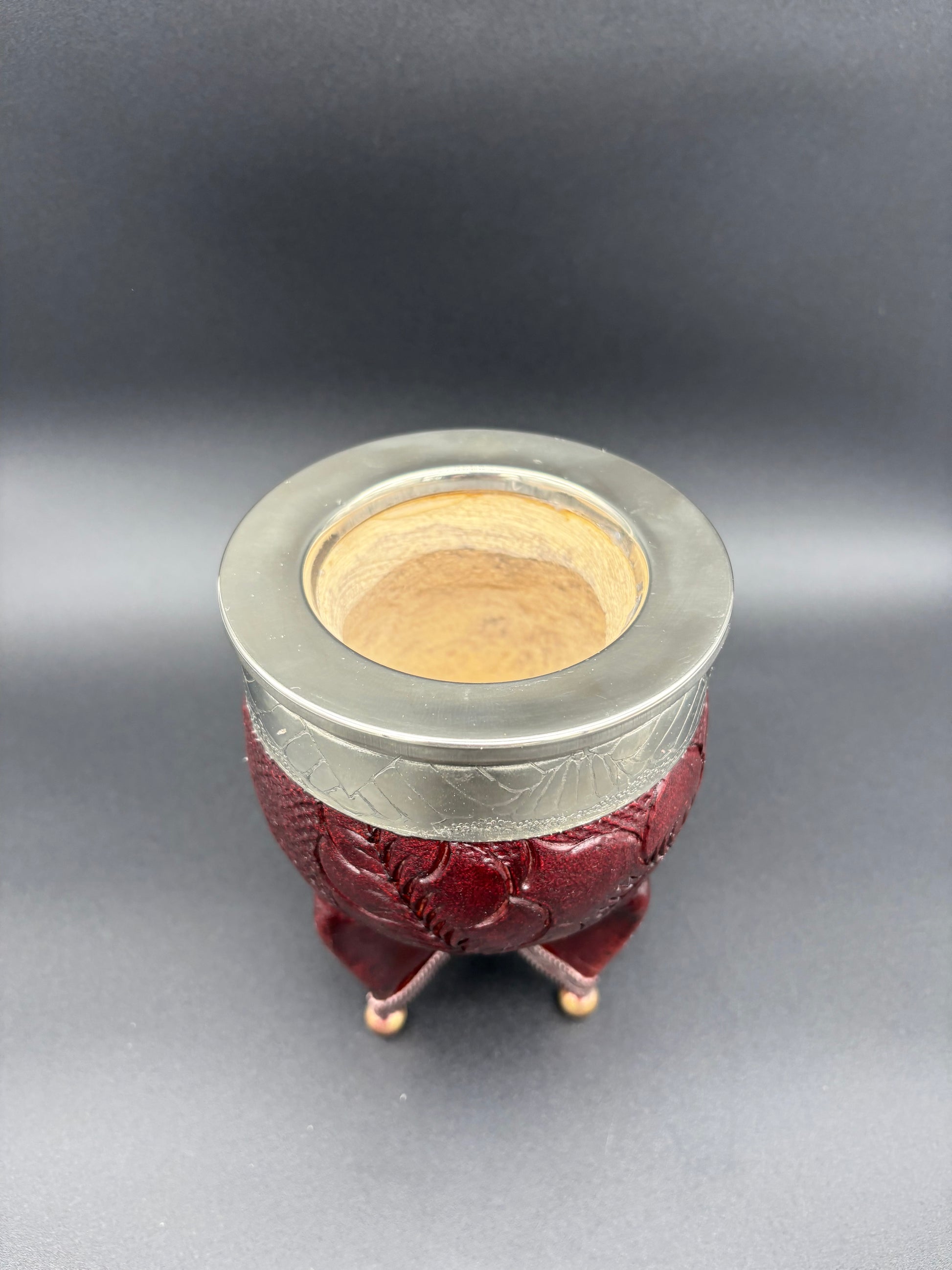 Imperial con interior de calabaza, cuero grueso repujado, virola de alpaca, base de alpaca y bolitas en bronce.