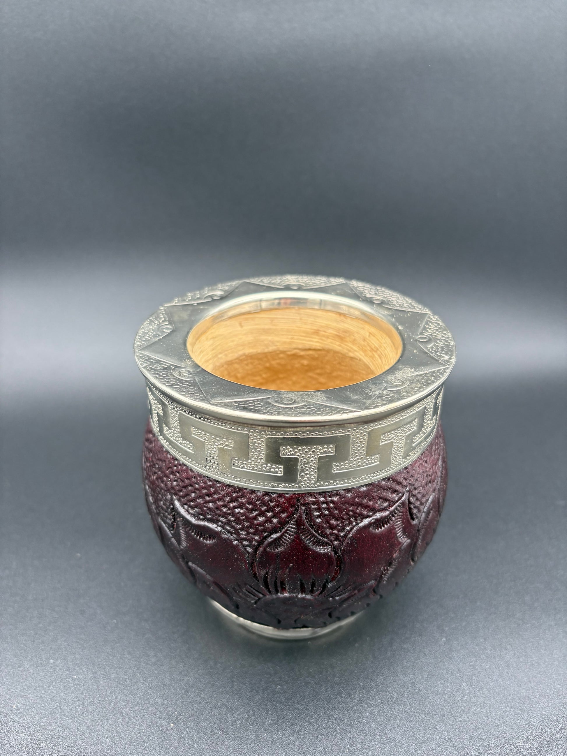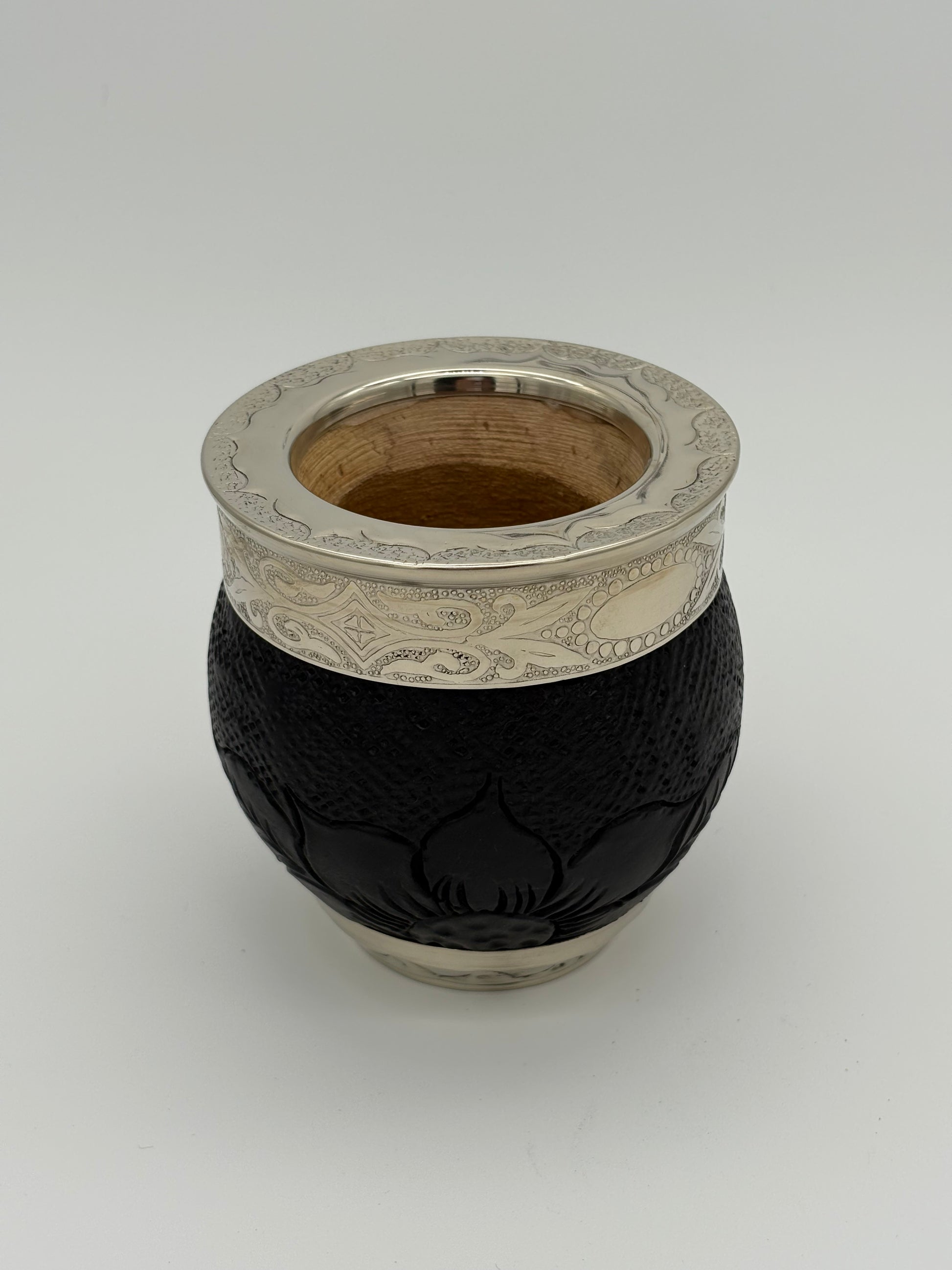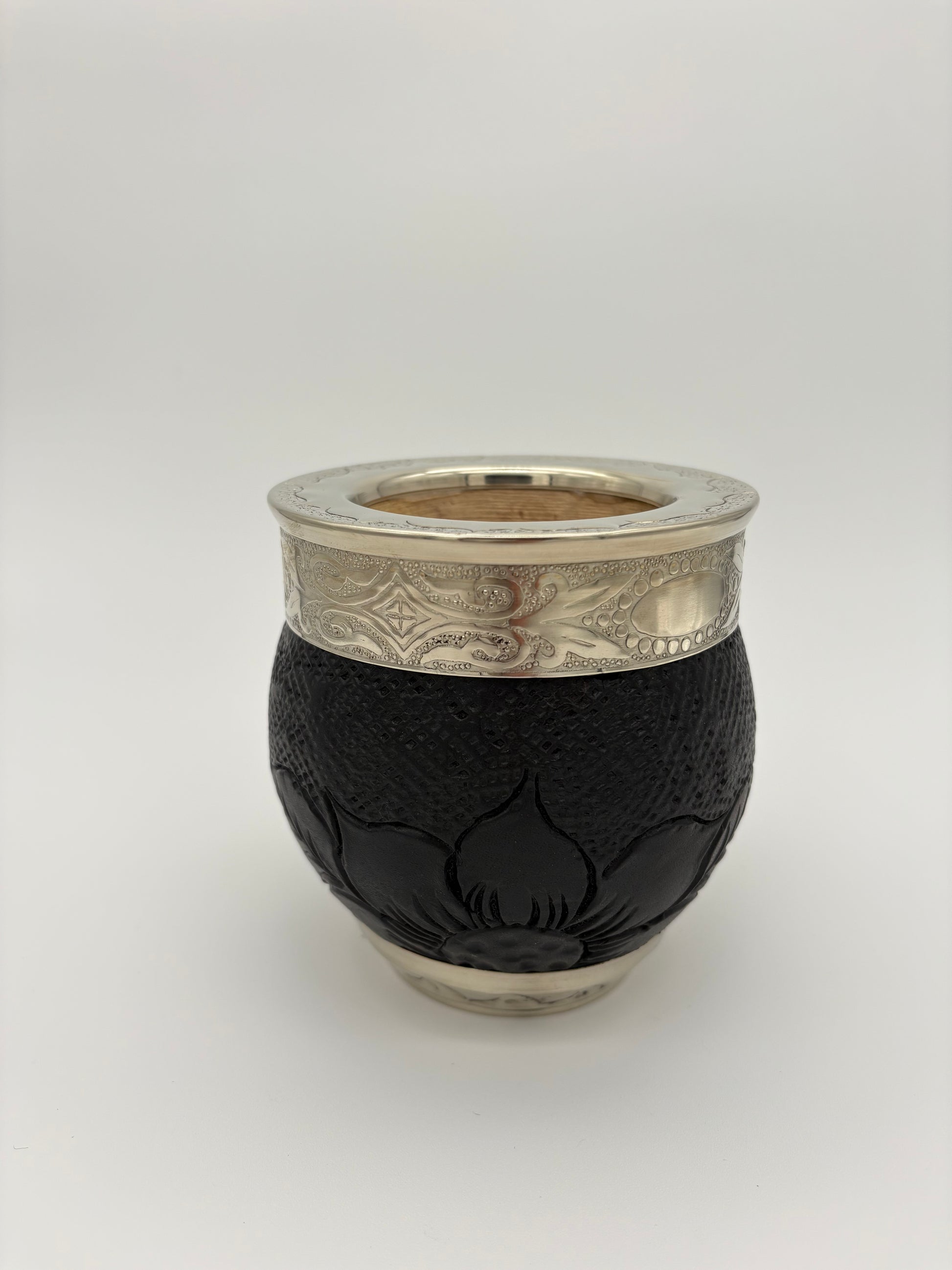 Imperial con interior de calabaza, cuero repujado a mano, virola y base de alpaca cincelada.