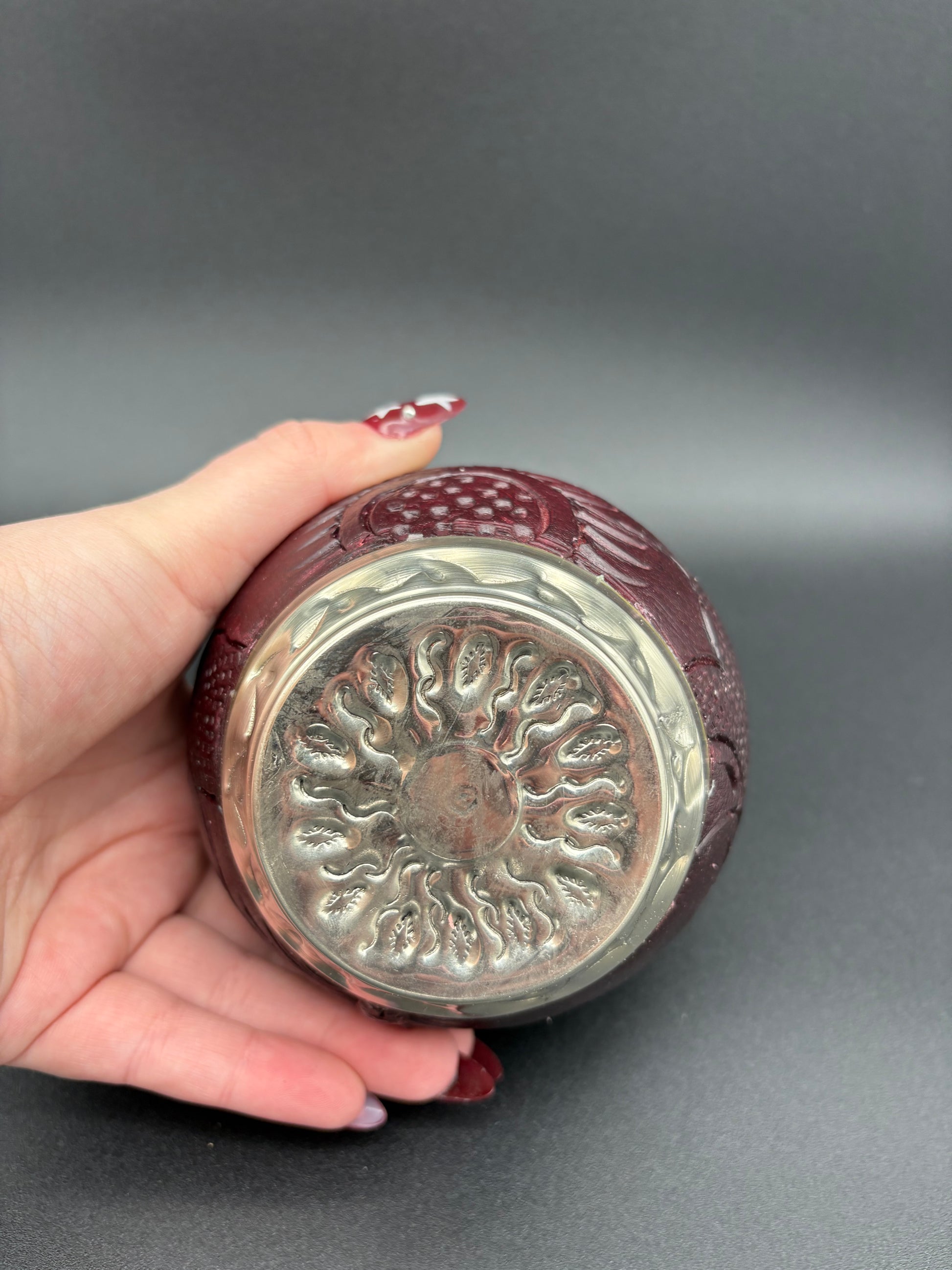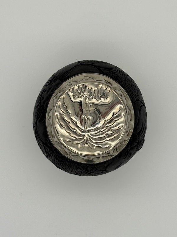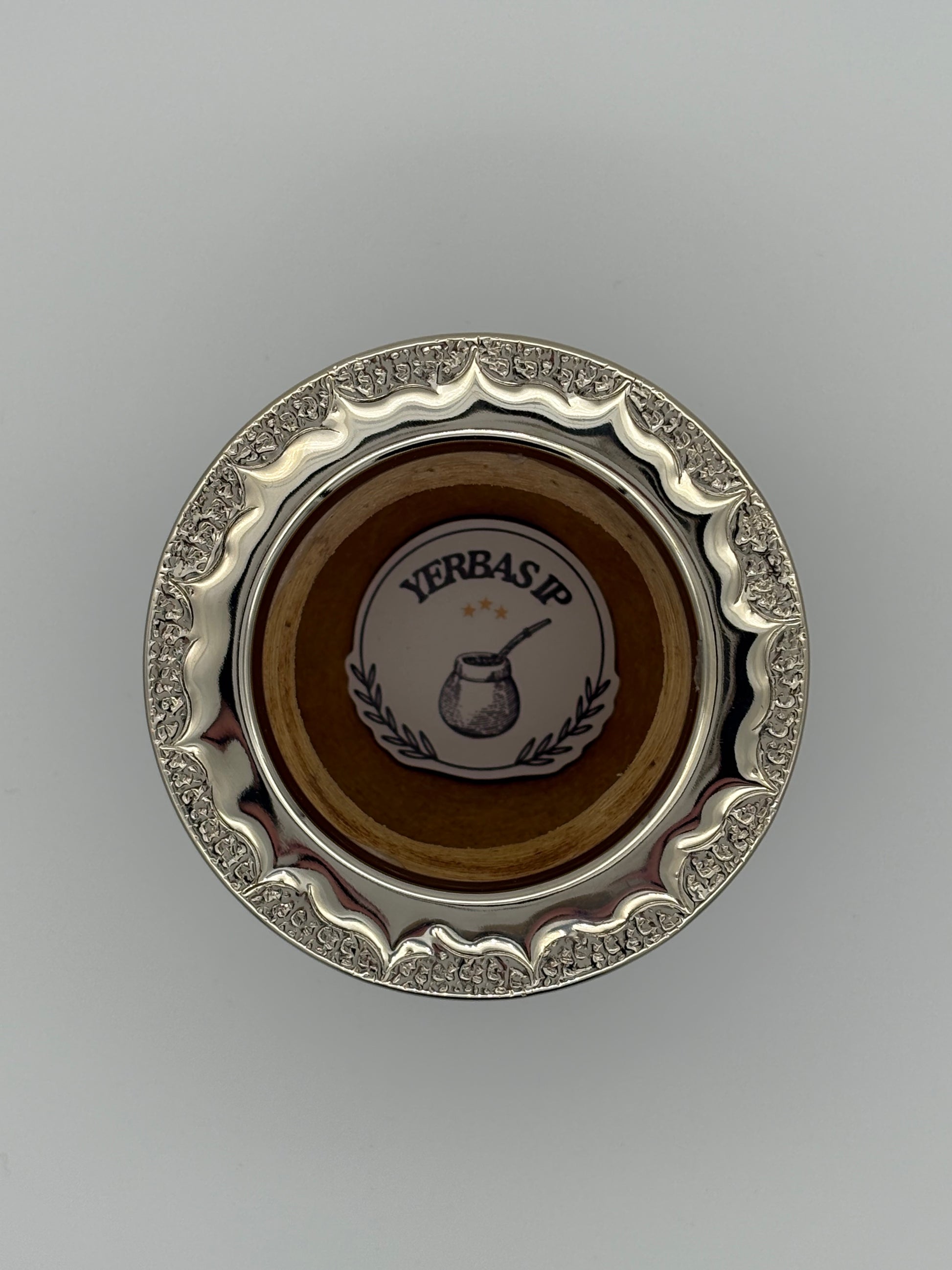 Imperial con interior de calabaza, cuero repujado a mano, virola y base de alpaca cincelada.