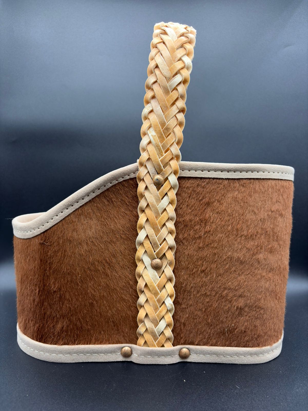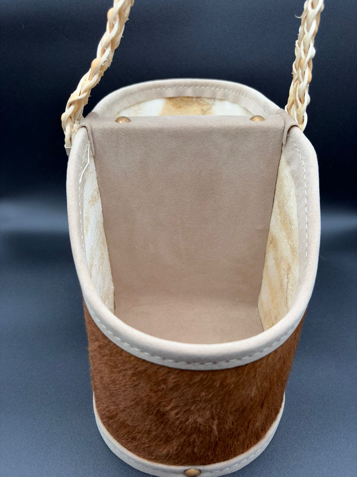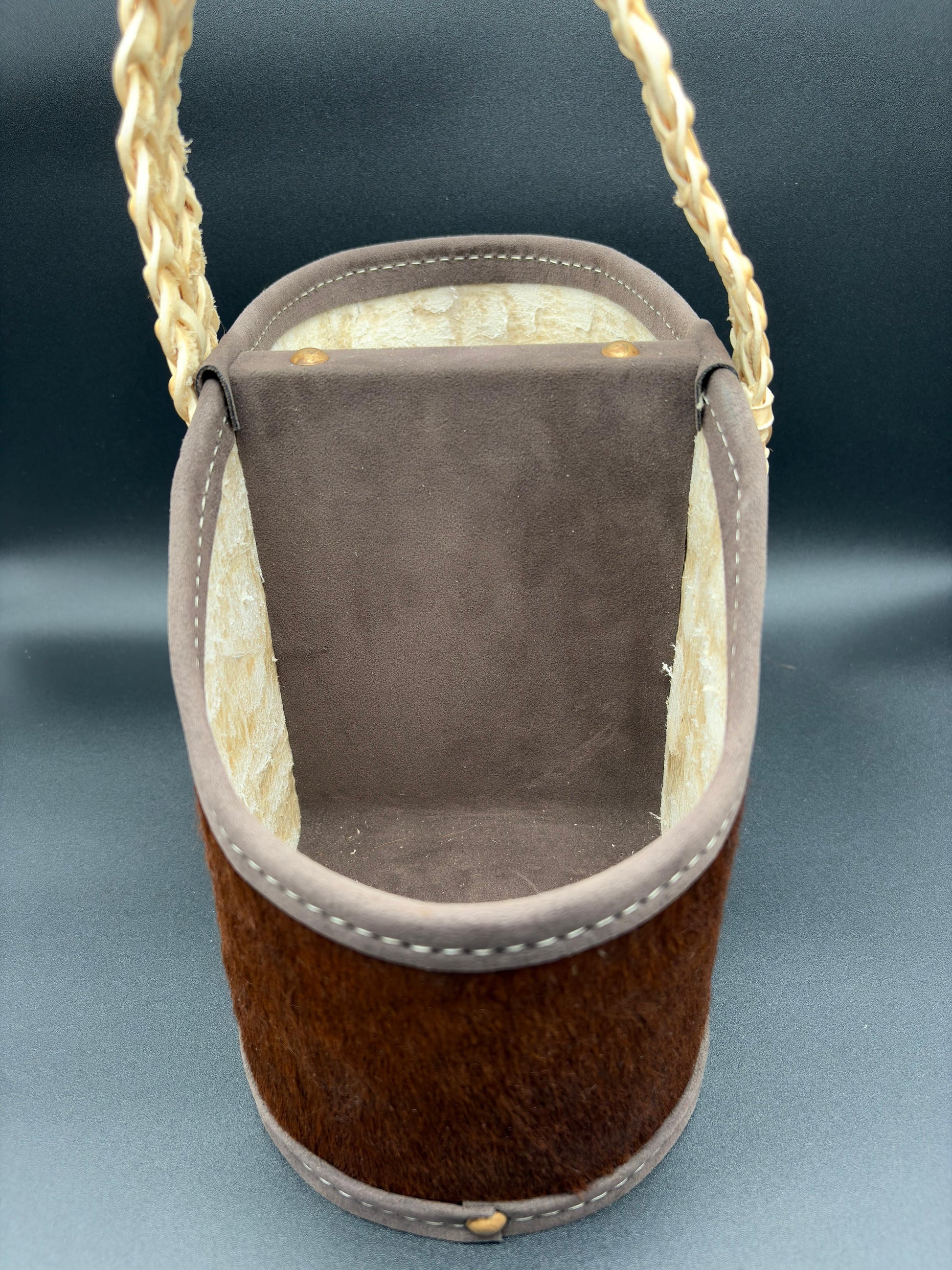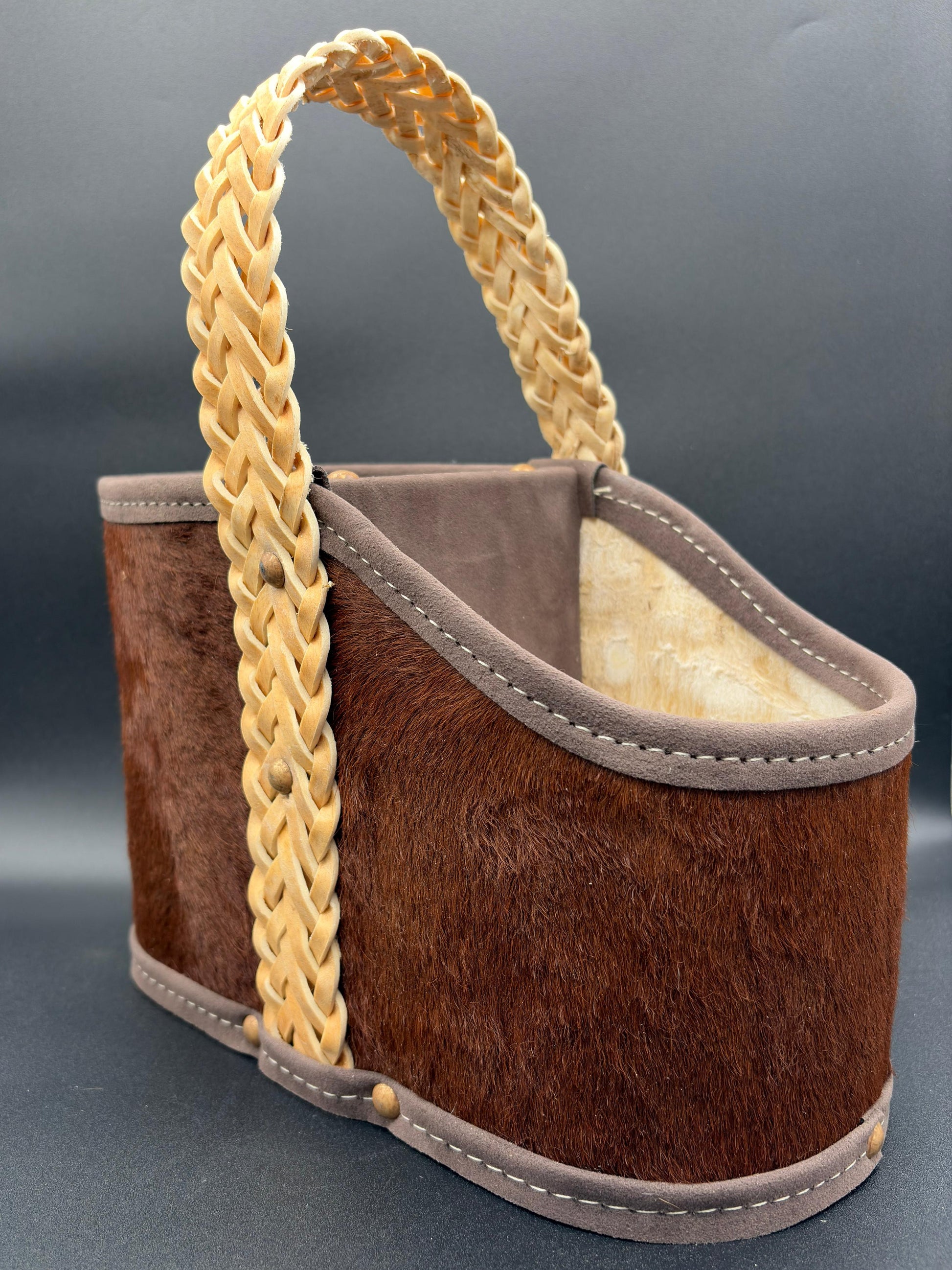 Matera de 2 cuerpos, forrado en cuero con pelo con manija rígida cocida en tiento trenzado con interior forrado en pana