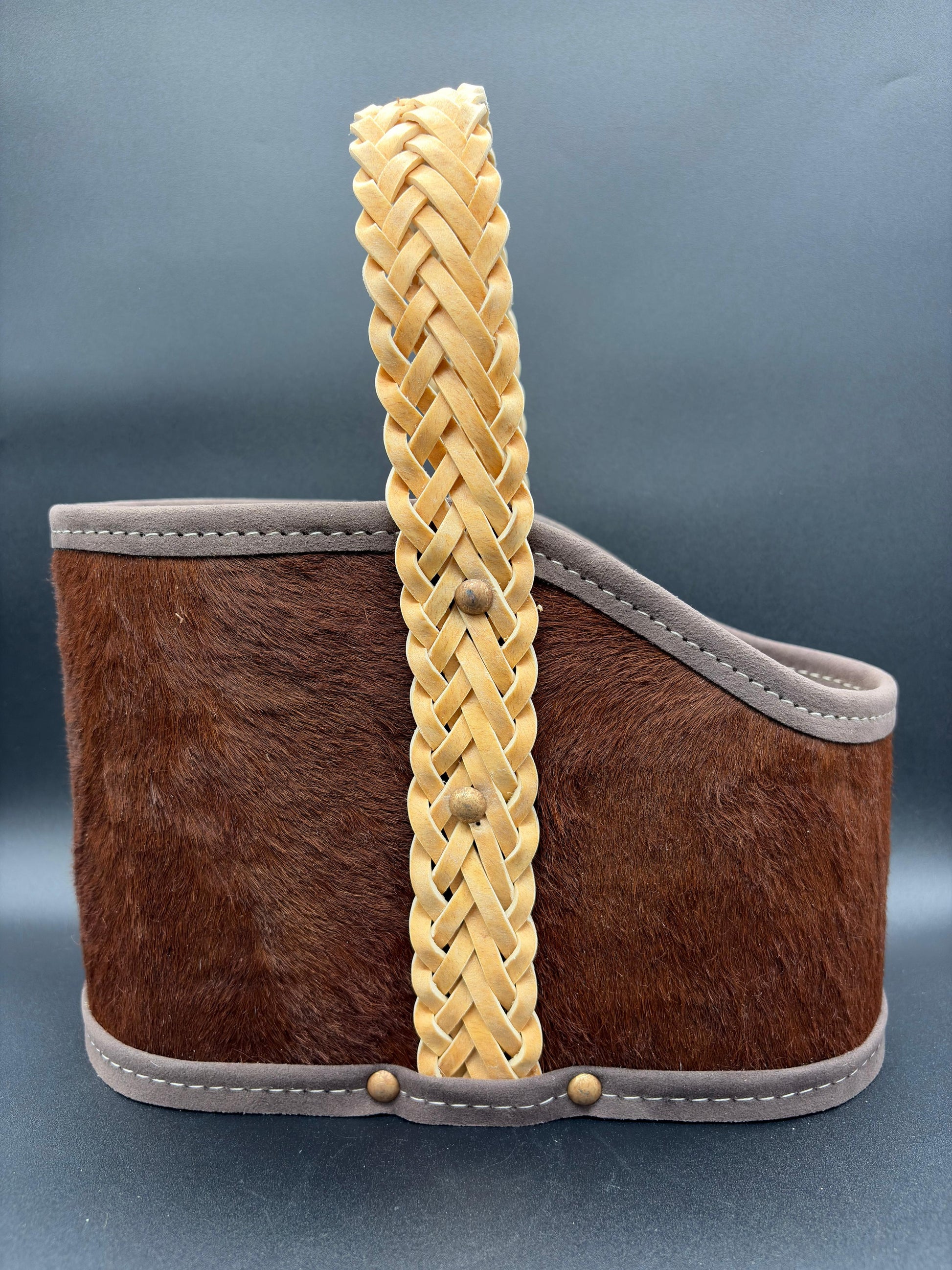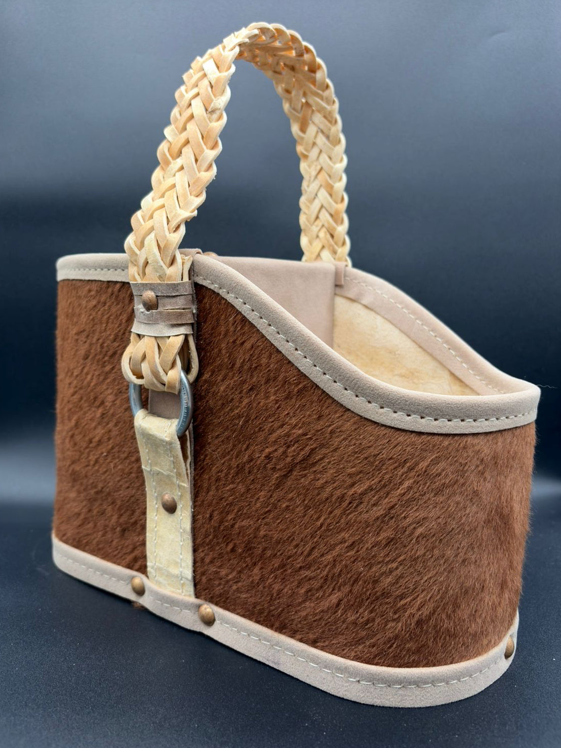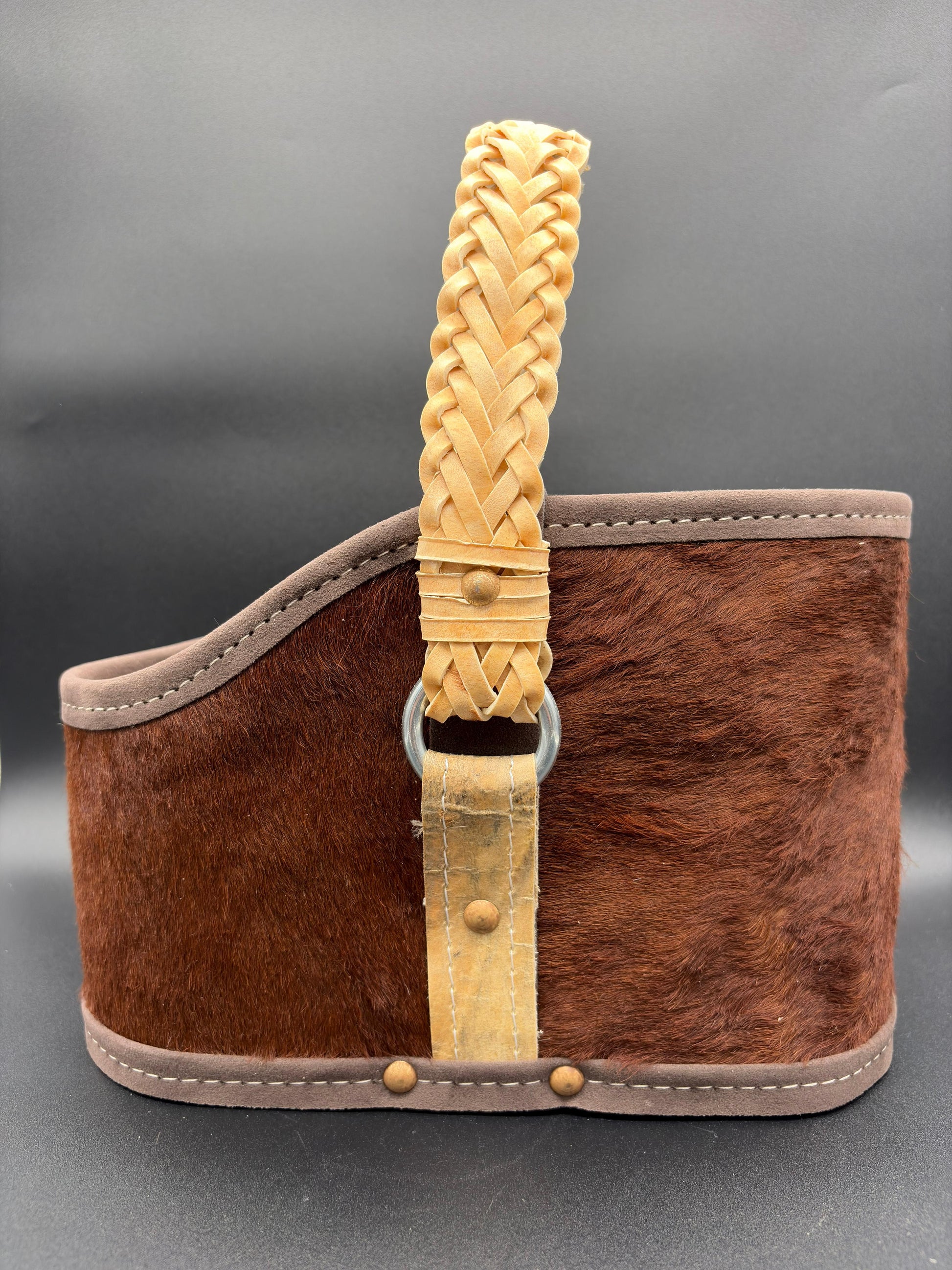 Matera de 2 cuerpos, forrado en cuero con pelo con manija rígida cocida en tiento trenzado con interior forrado en pana