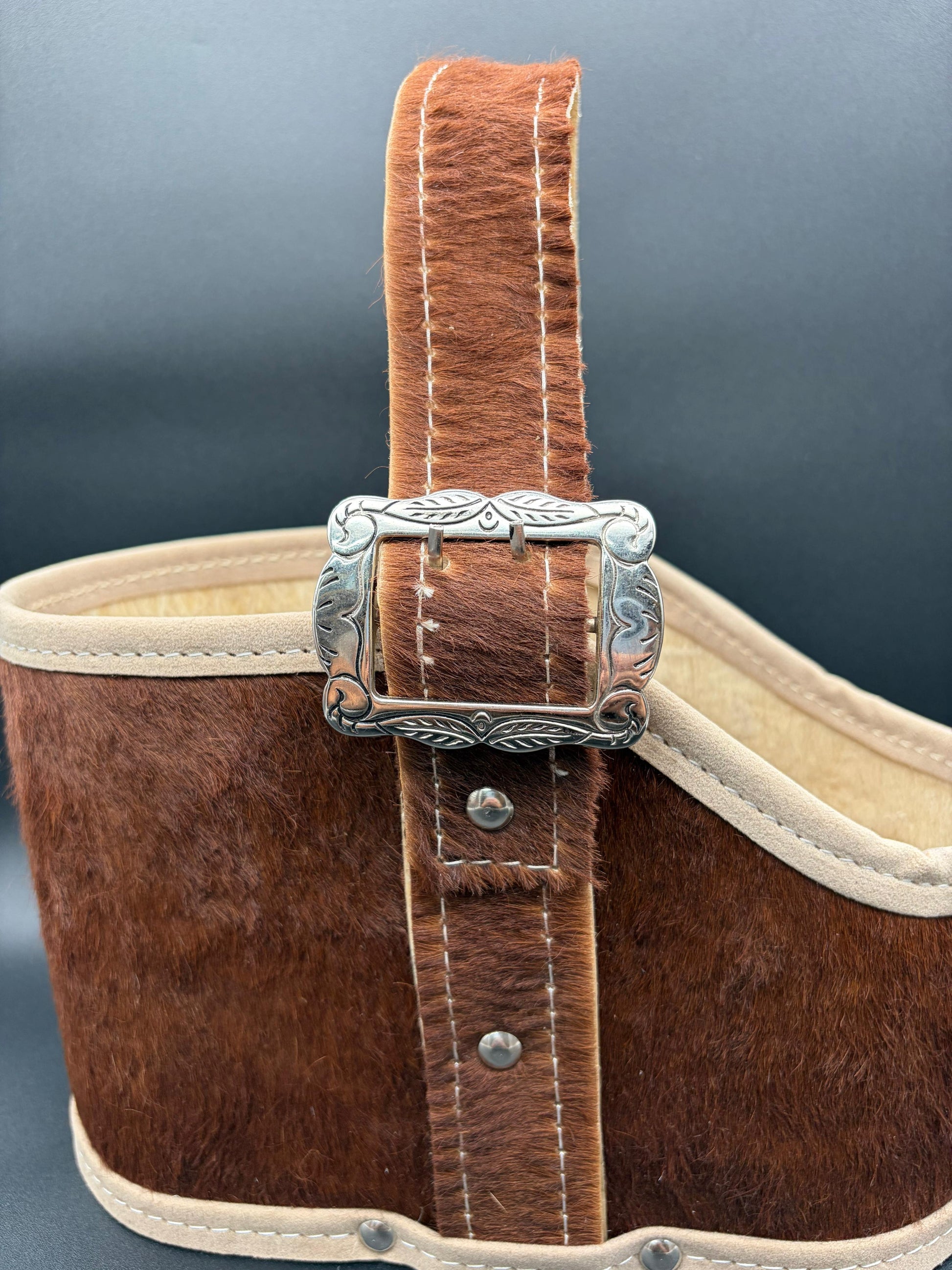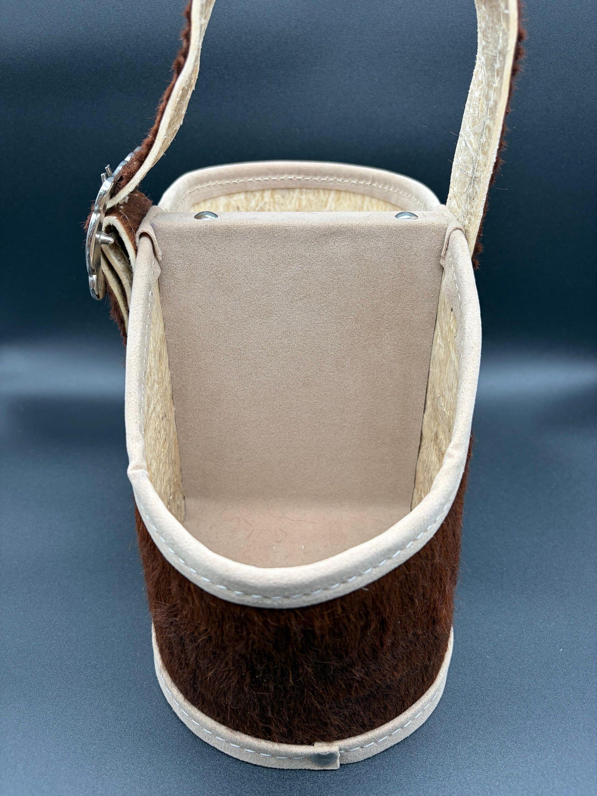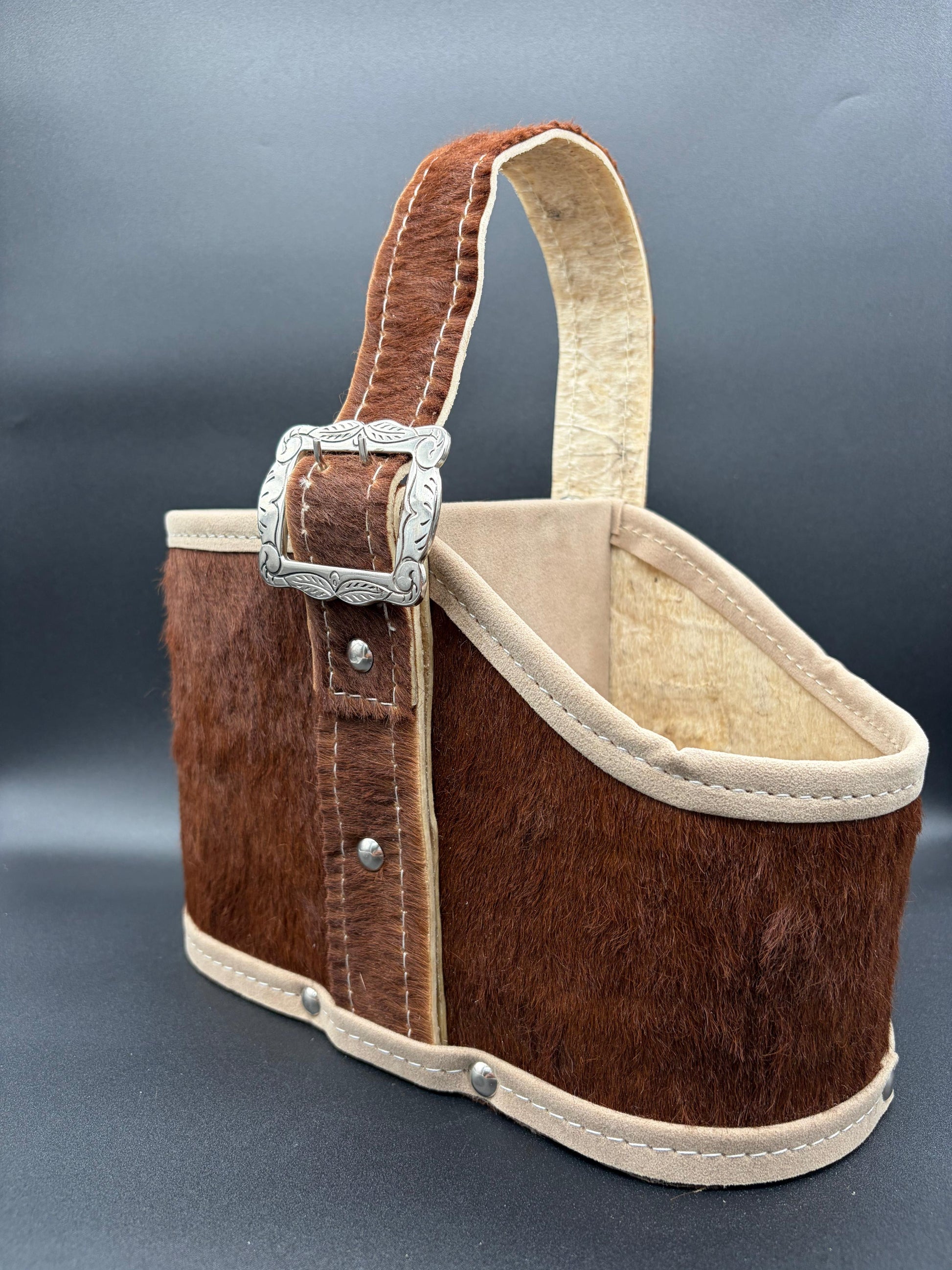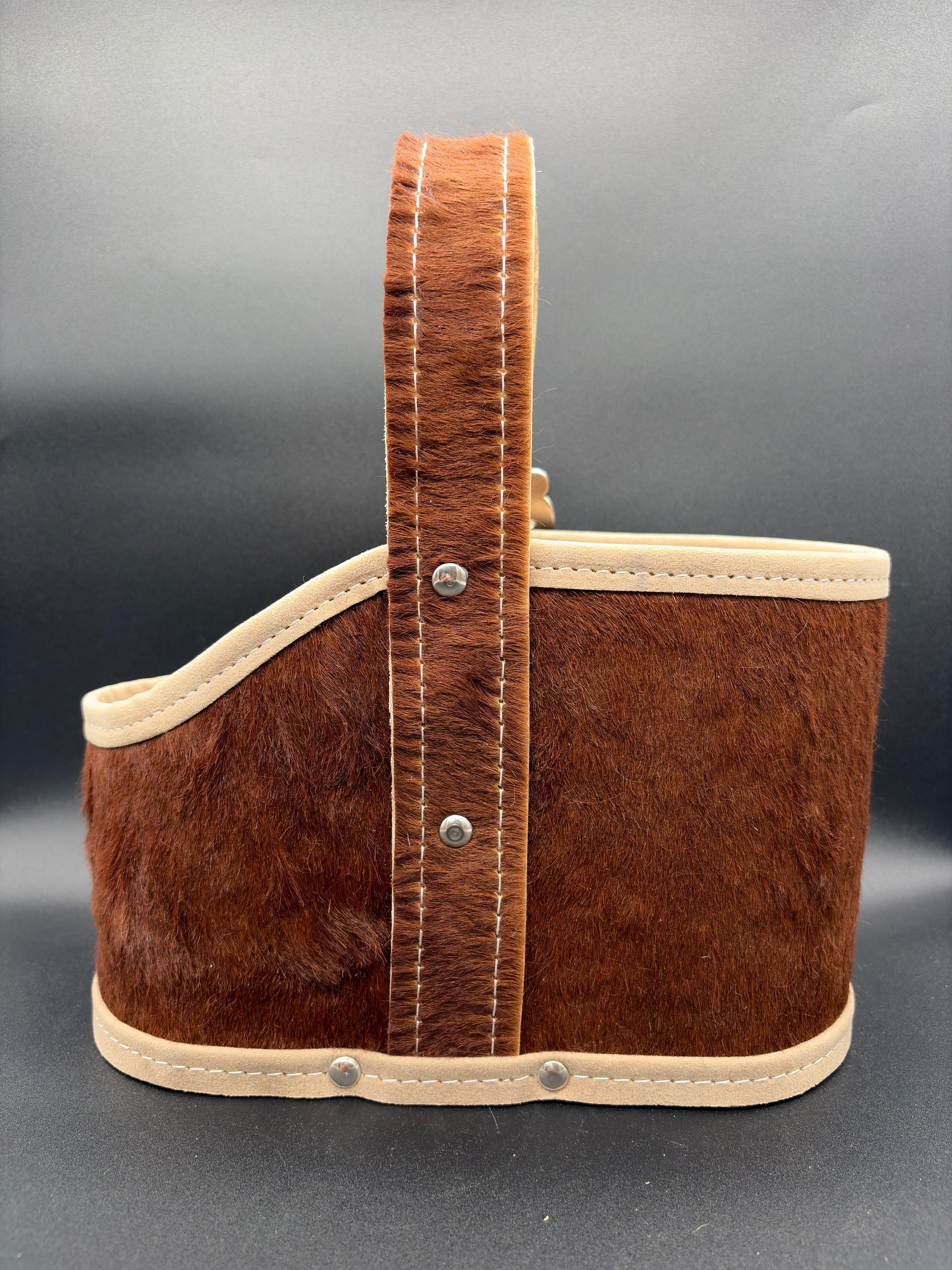 Matera de 2 cuerpos, forrado en cuero con pelo con manija rígida cocida en tiento trenzado con interior forrado en pana