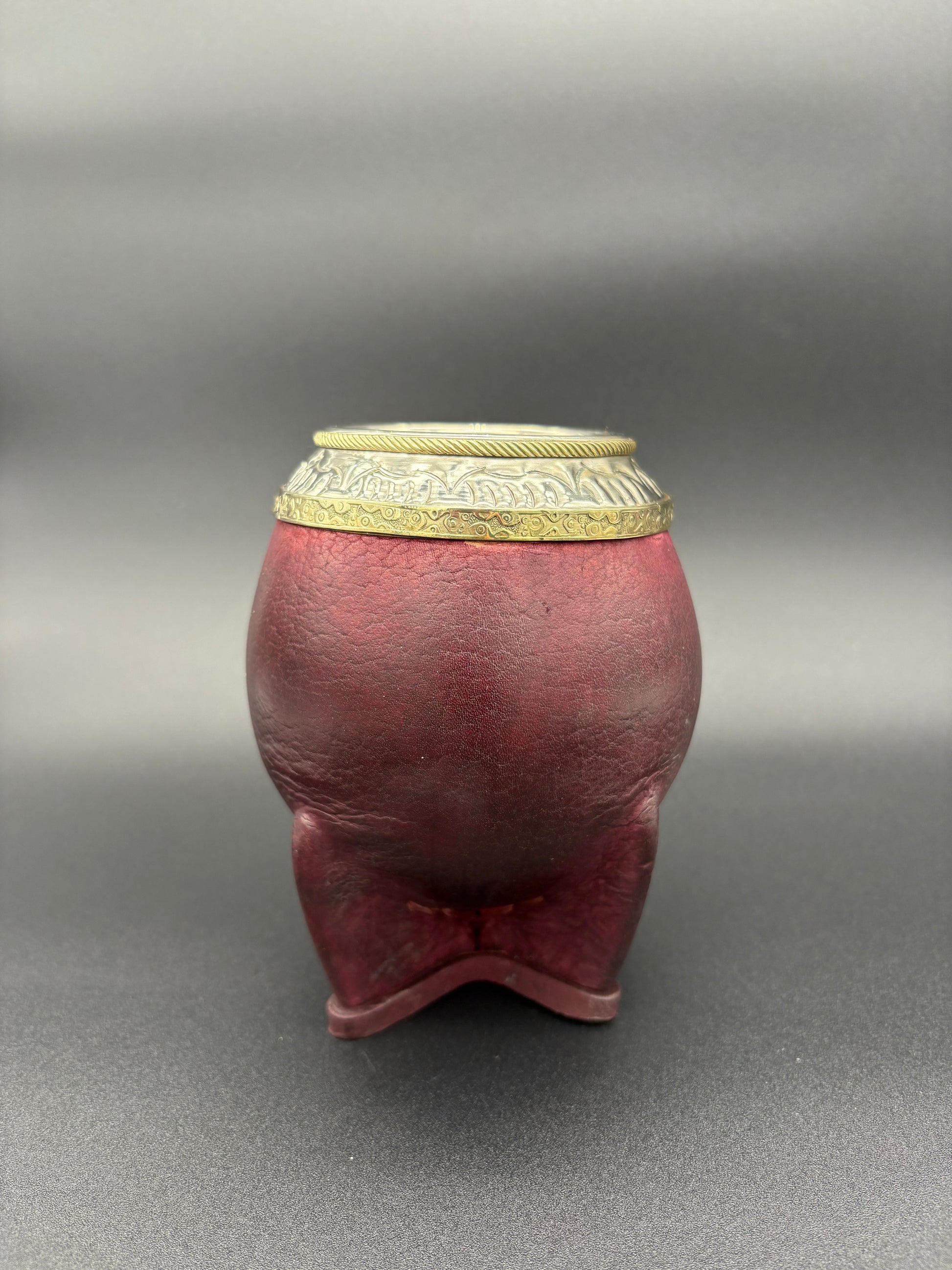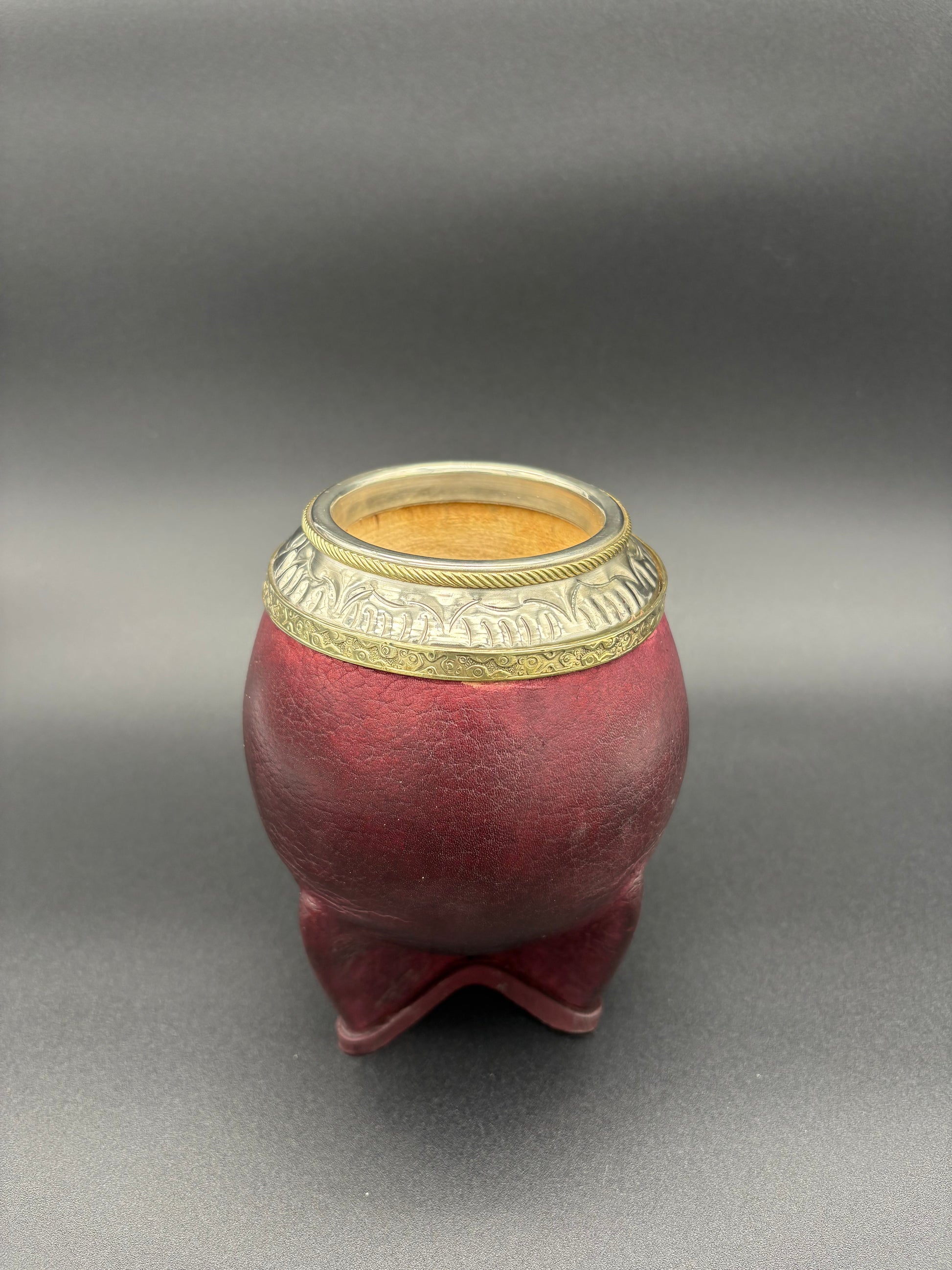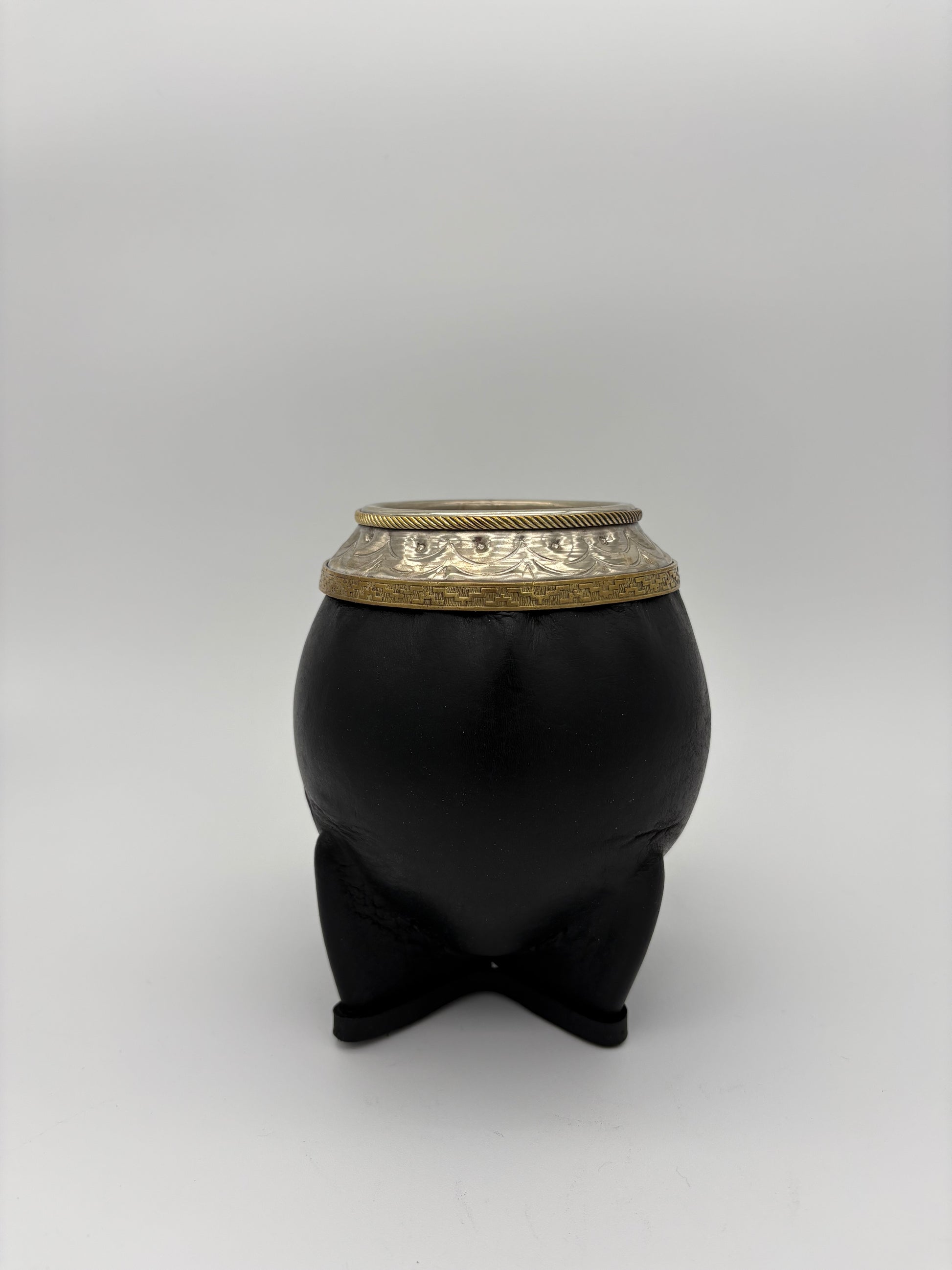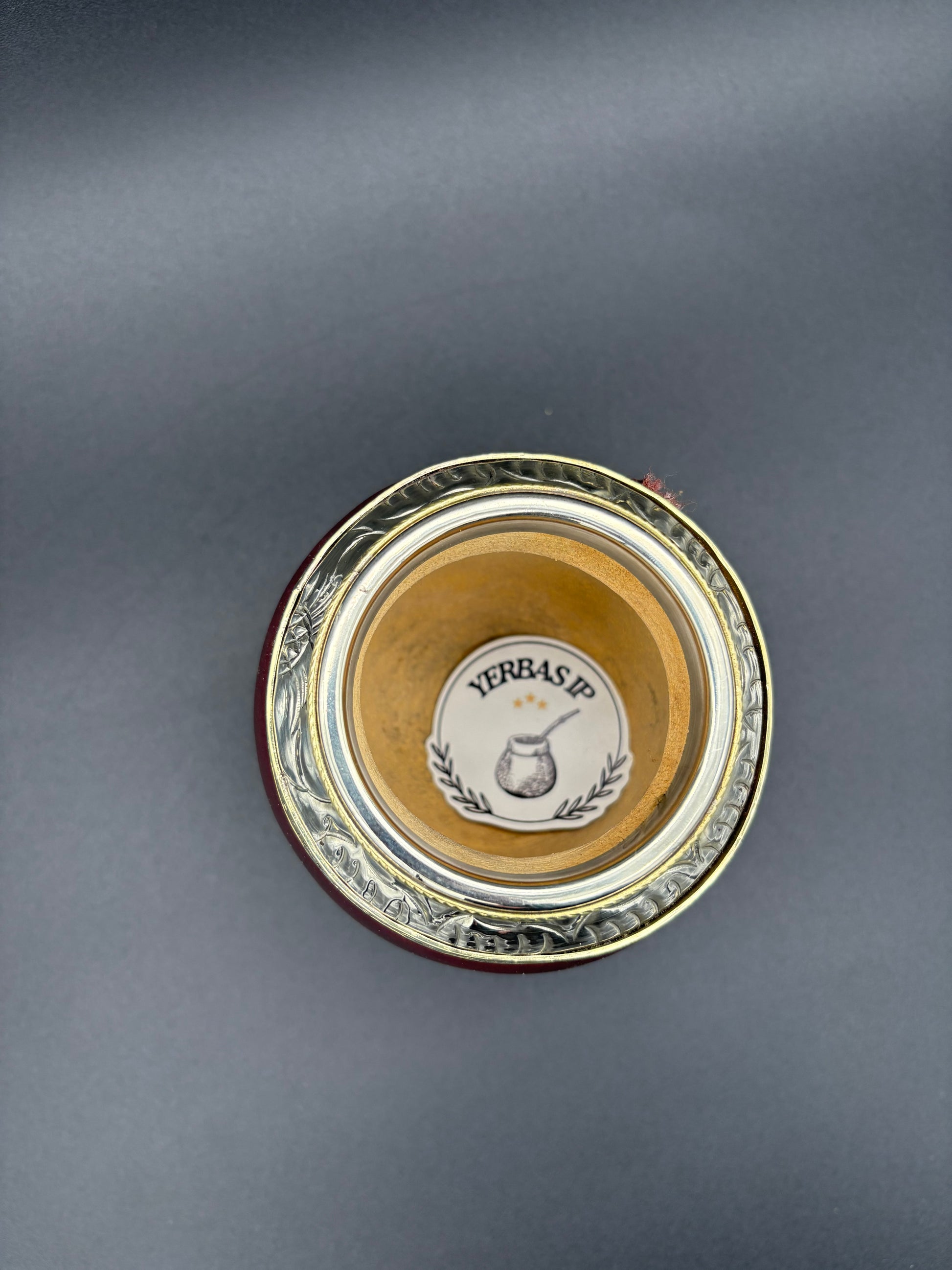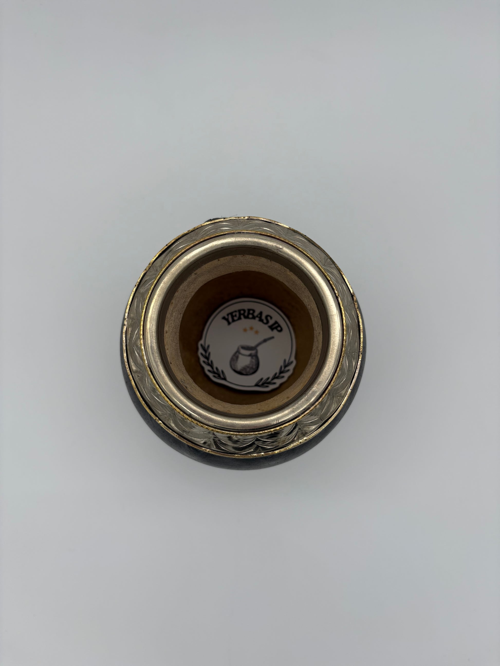 Torpedo con interior de calabaza, virola de alpaca cincelada con doble aro en bronce.
