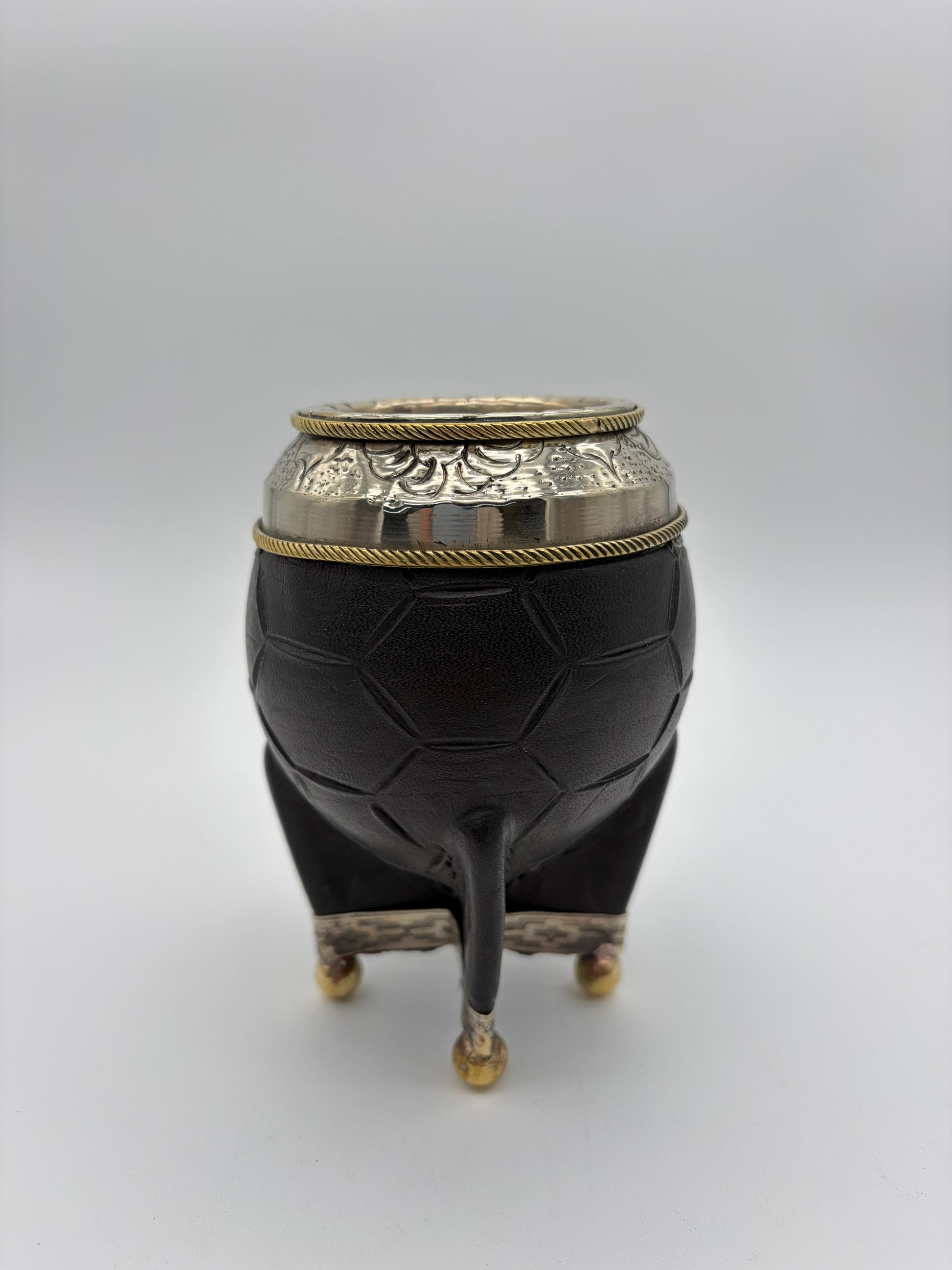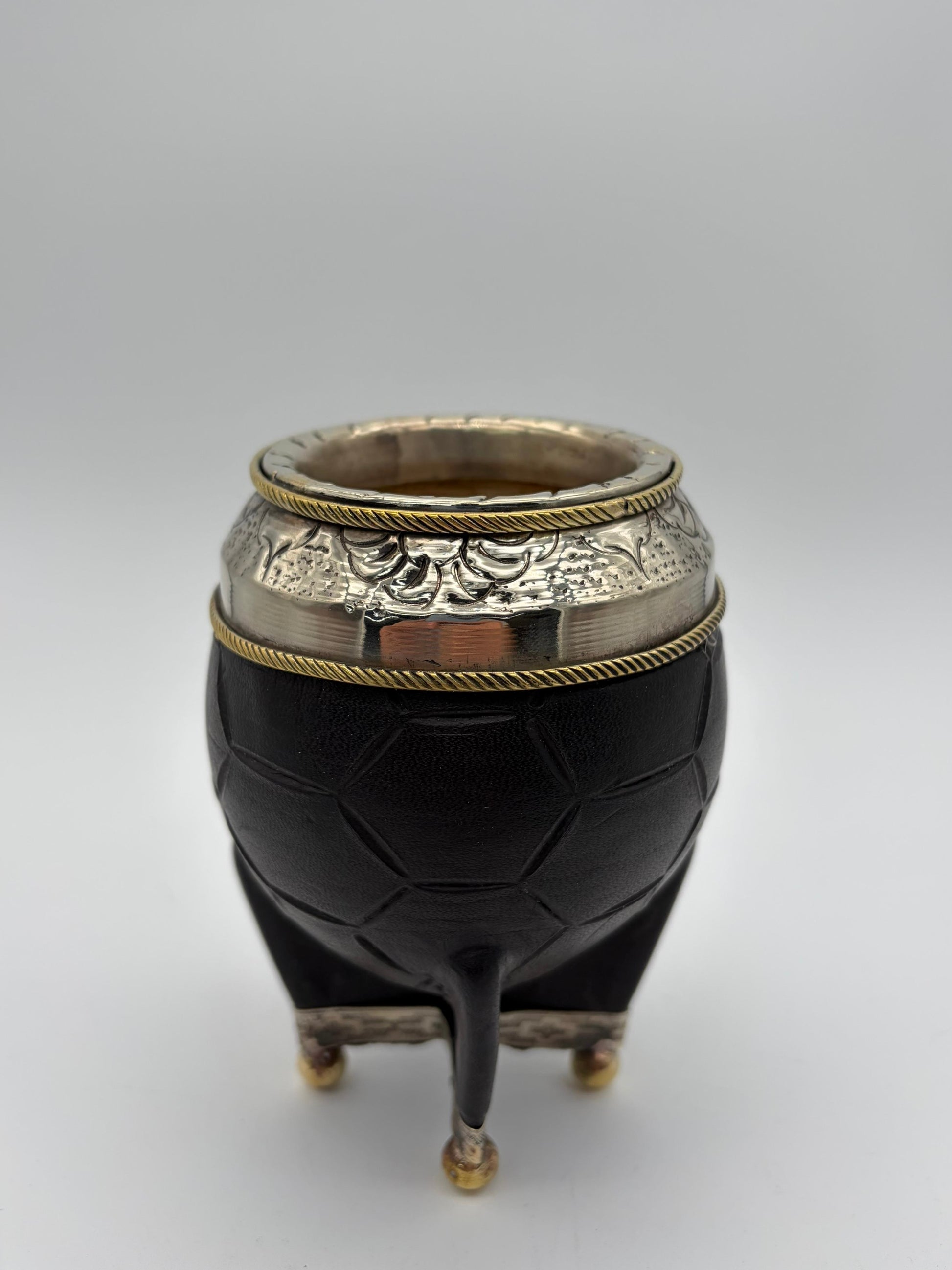 Torpedo con interior de calabaza, forrado en cuero pelota, virola de alpaca cincelada con doble aro en bronce, base de alpaca y bolitas en bronce.
