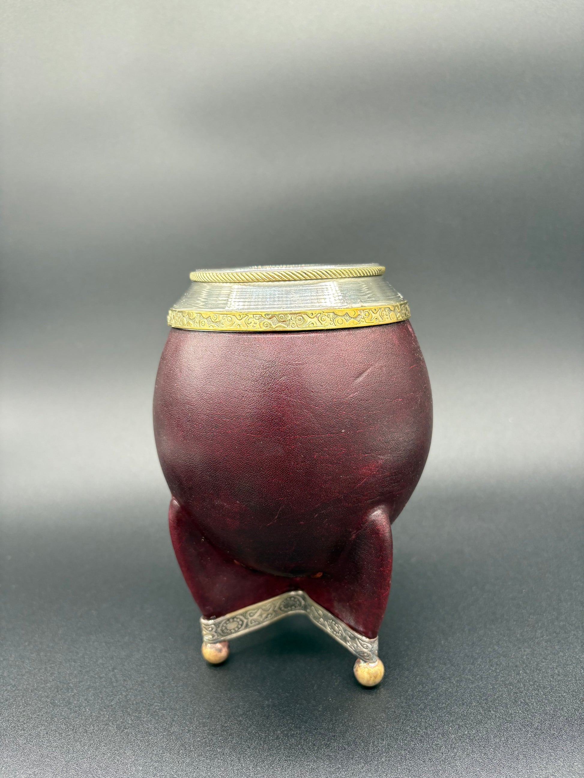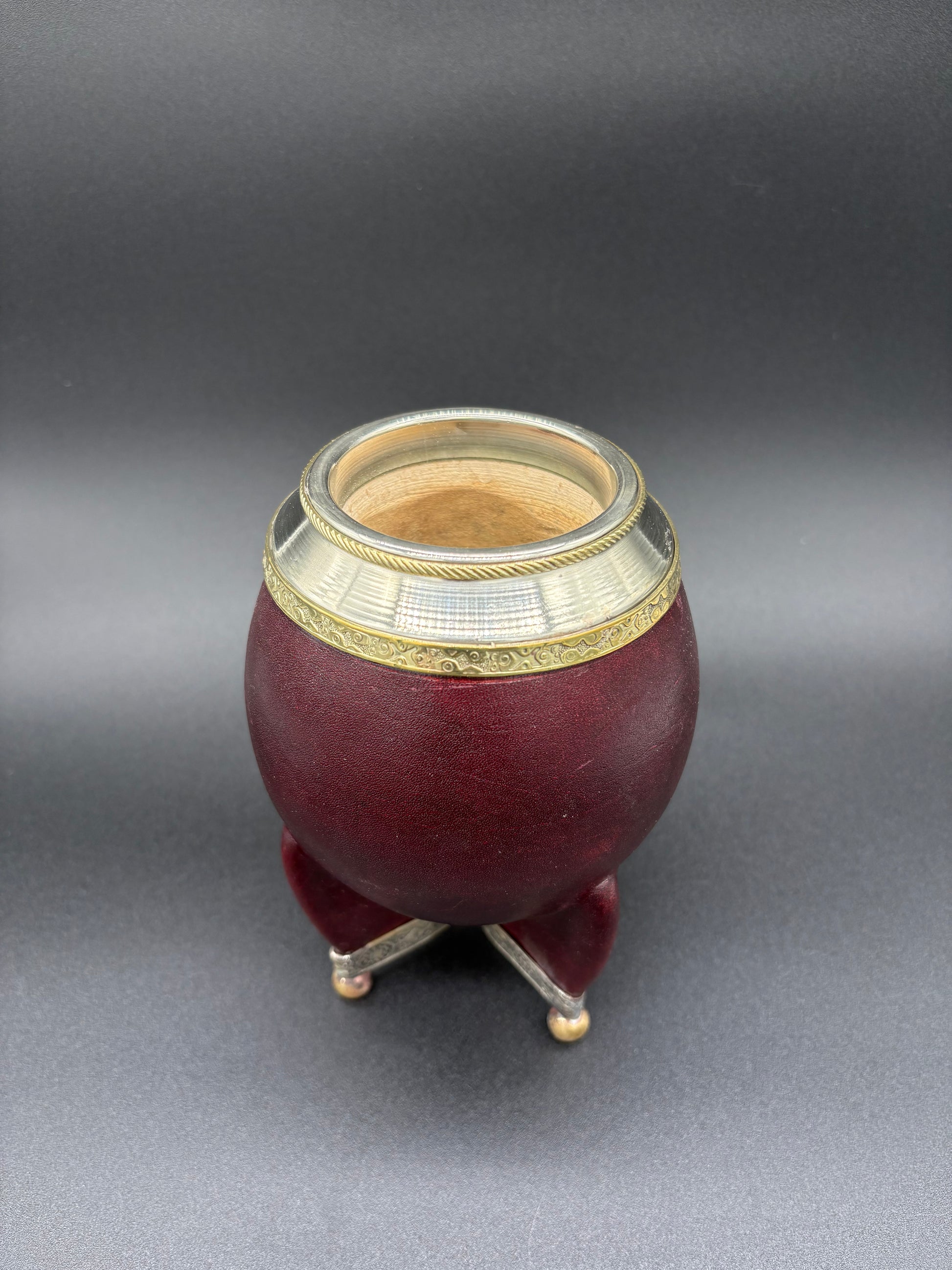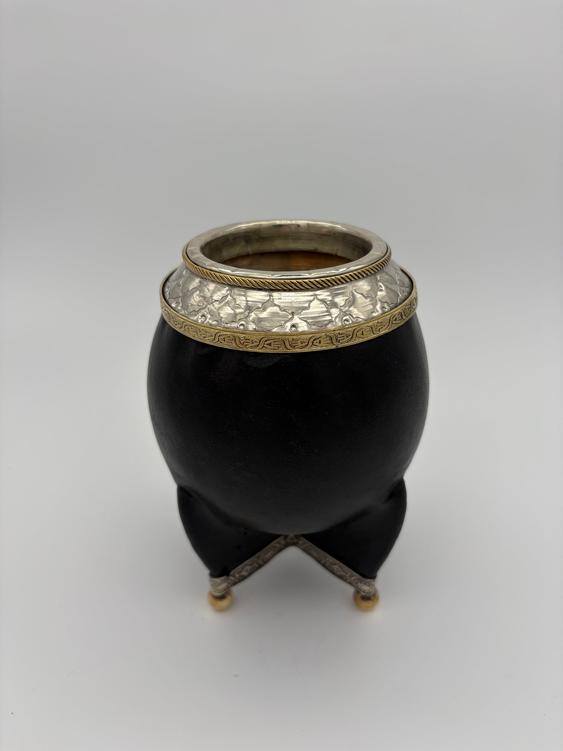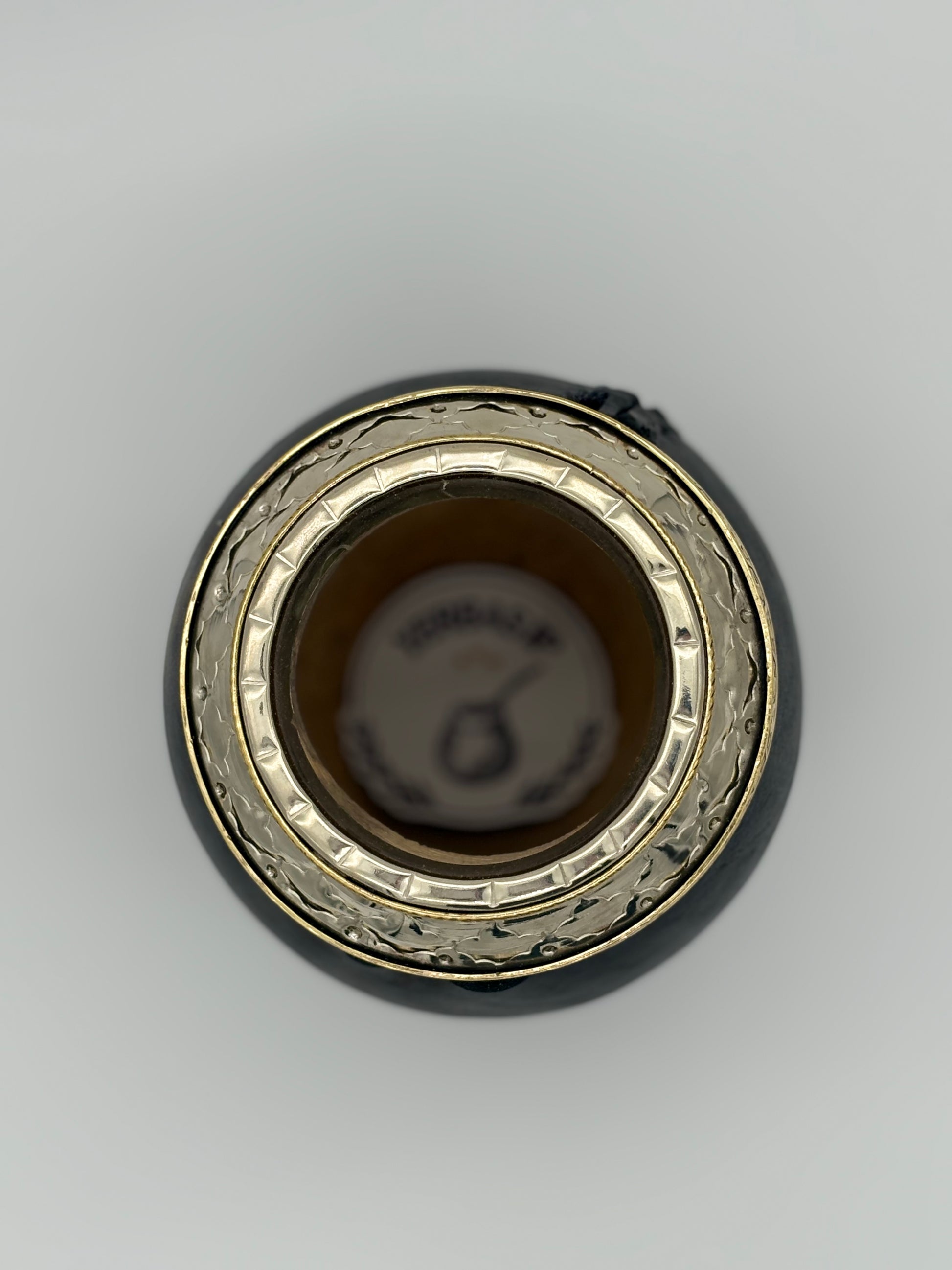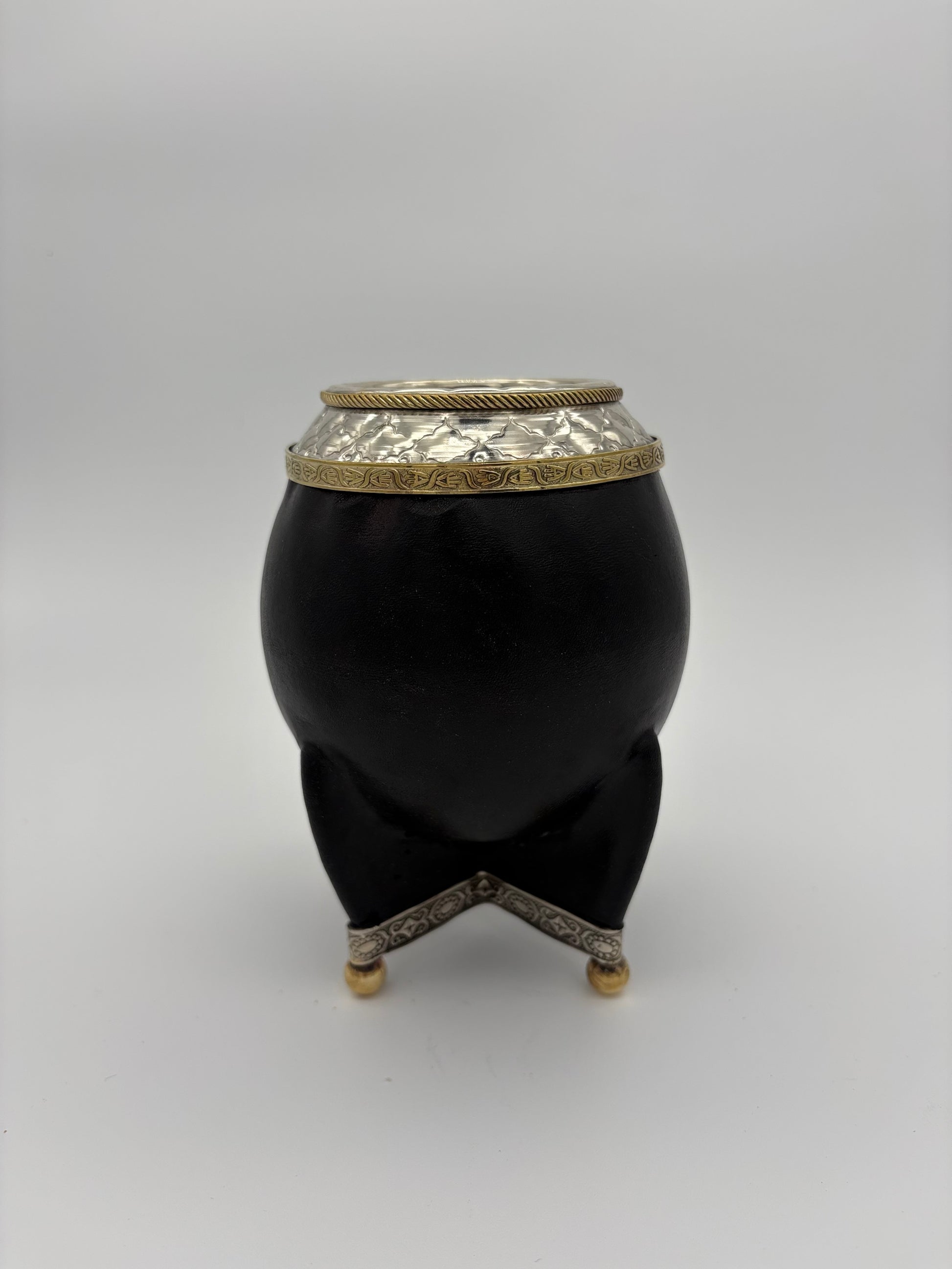 Torpedo con interior de calabaza, cuero grueso liso, virola de alpaca cincelada con doble aro en bronce, base de alpaca y bolitas en bronce.