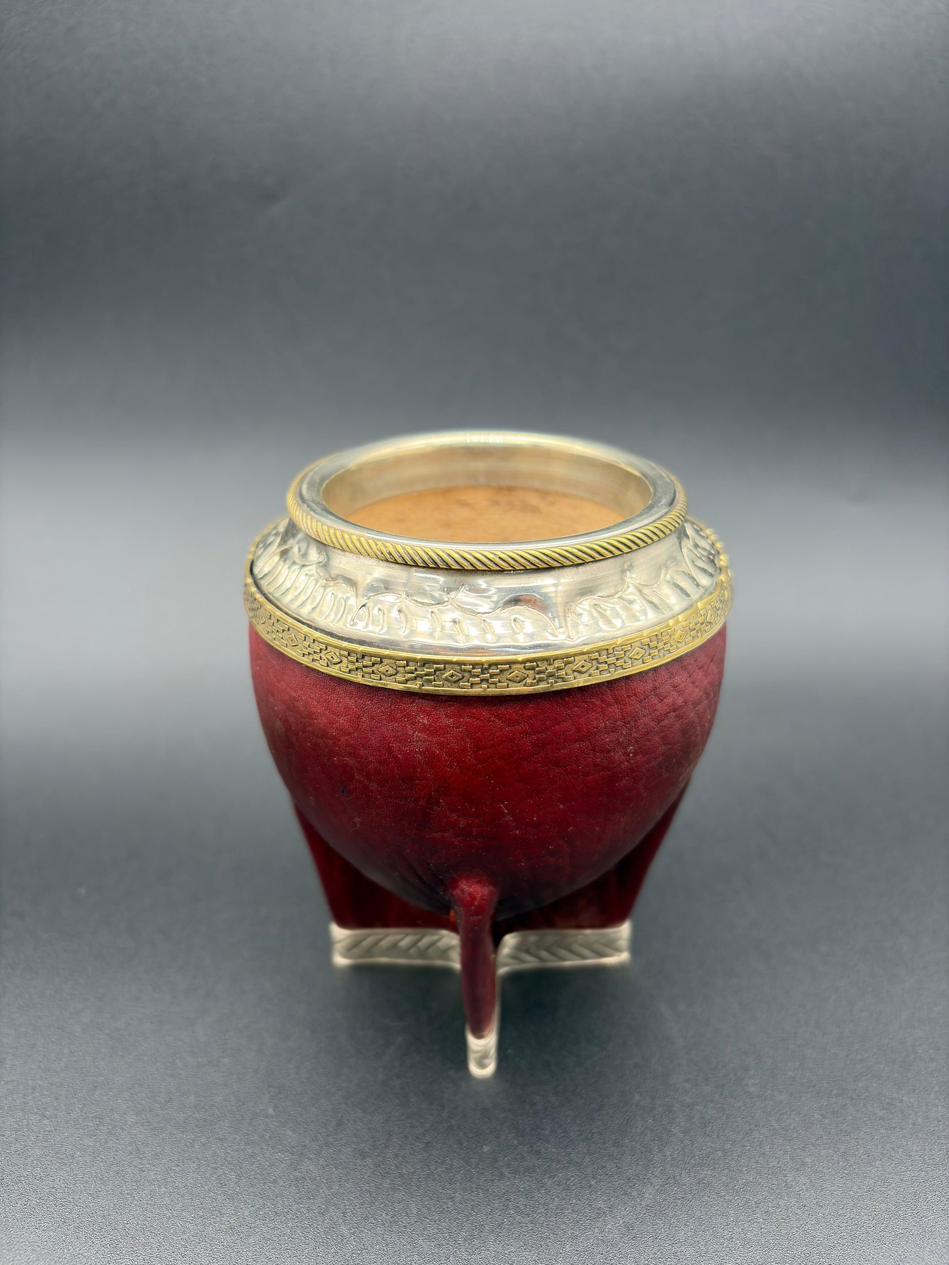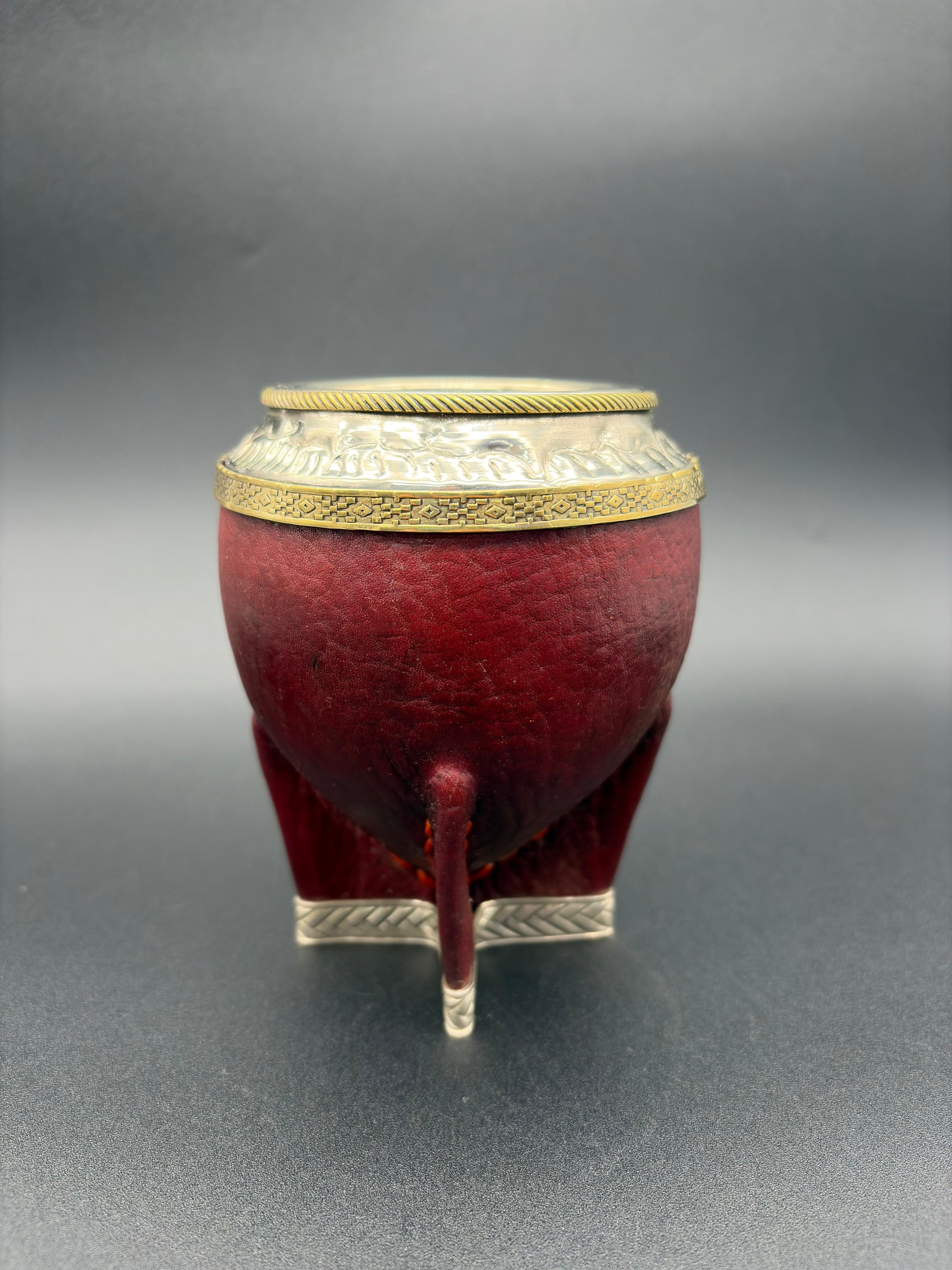 Torpedo con interior de calabaza, cuero grueso liso, virola de alpaca cincelada con doble aro en bronce y base de alpaca.