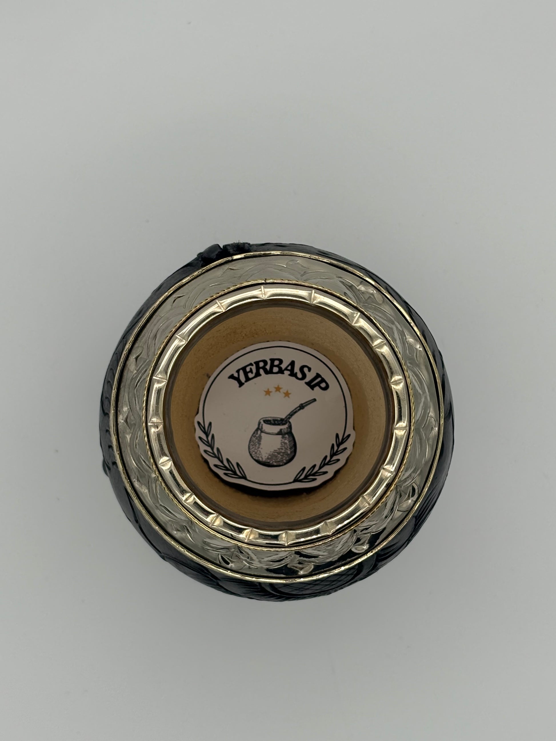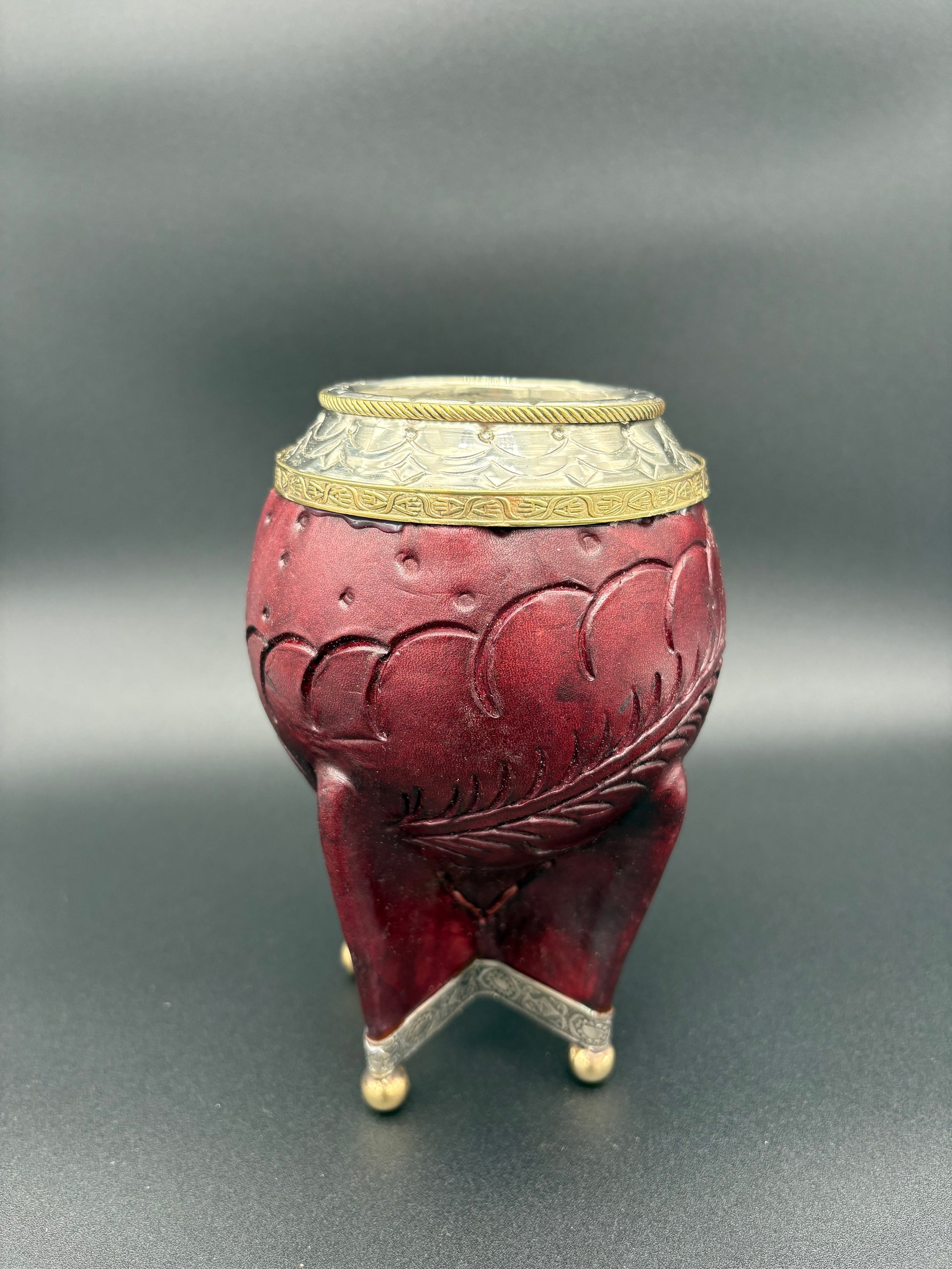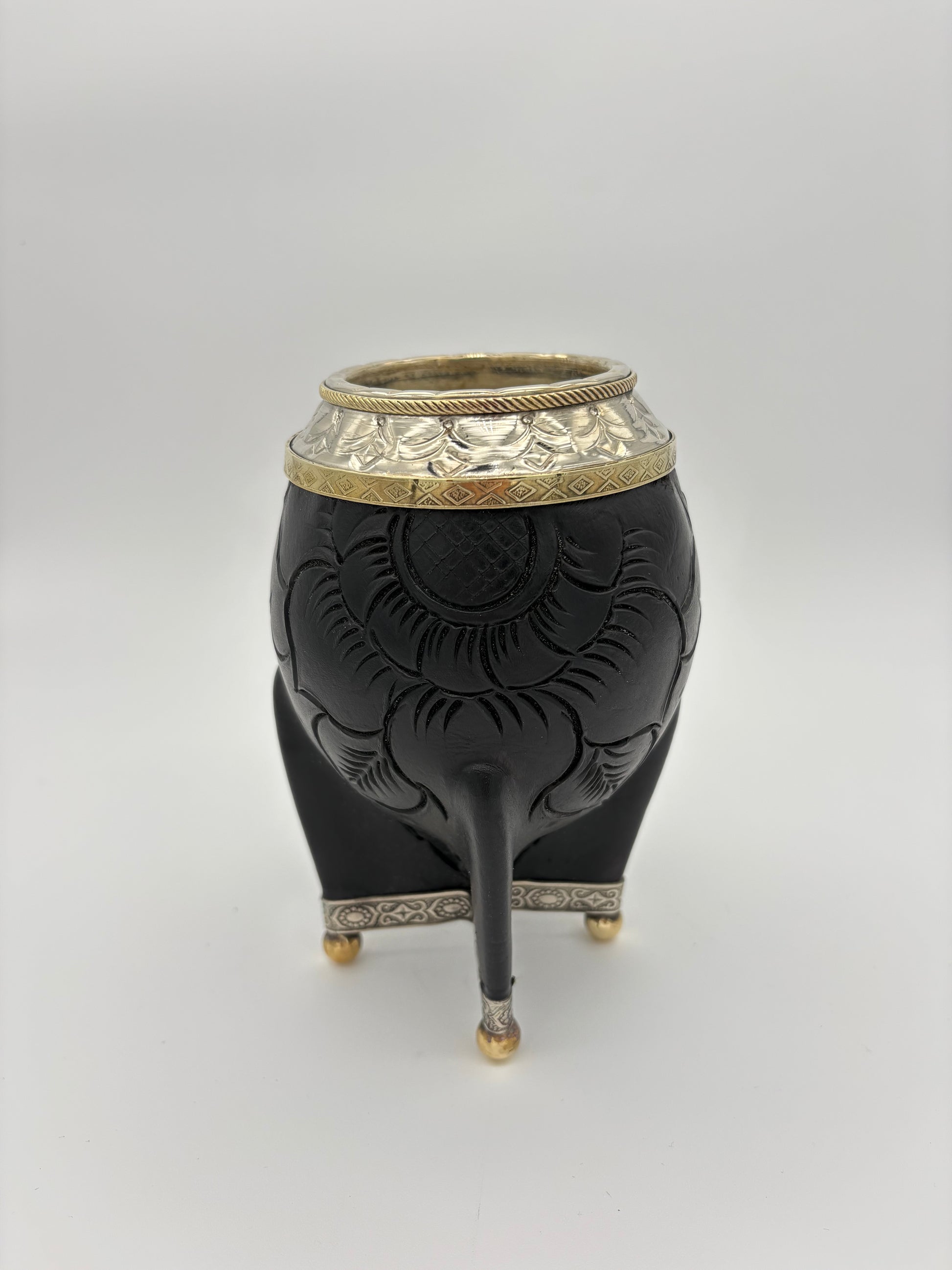 Torpedo con interior de calabaza, cuero grueso repujado, virola de alpaca cincelada con doble aro en bronce, base de alpaca y bolitas en bronce.