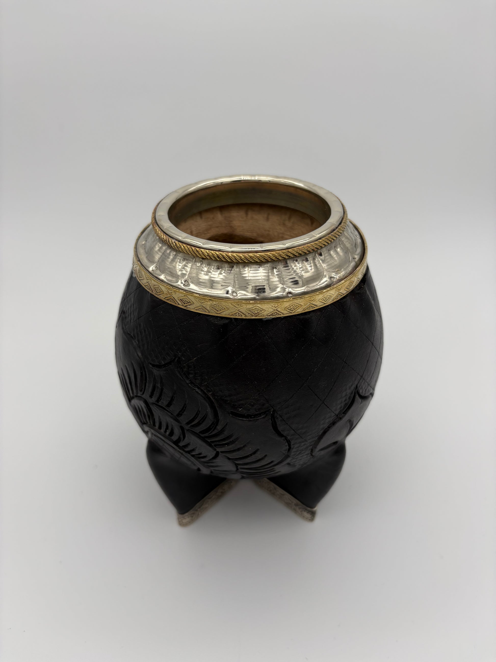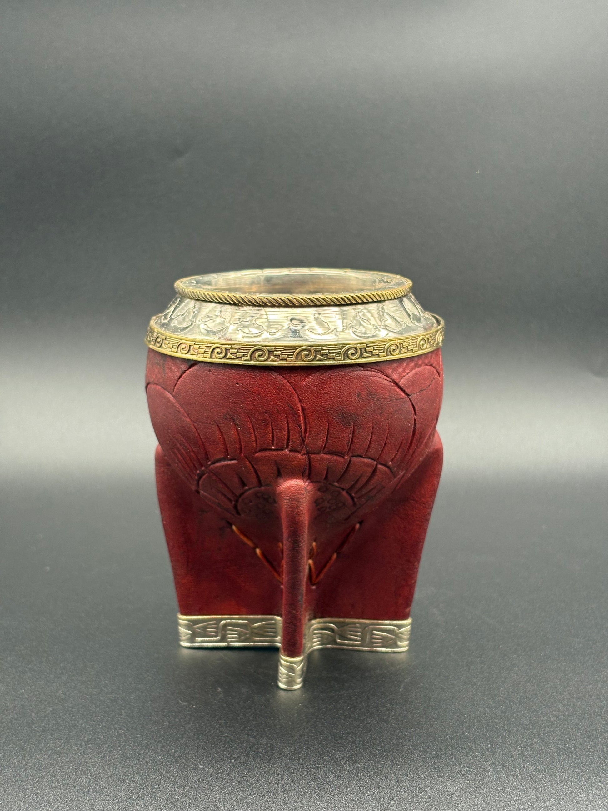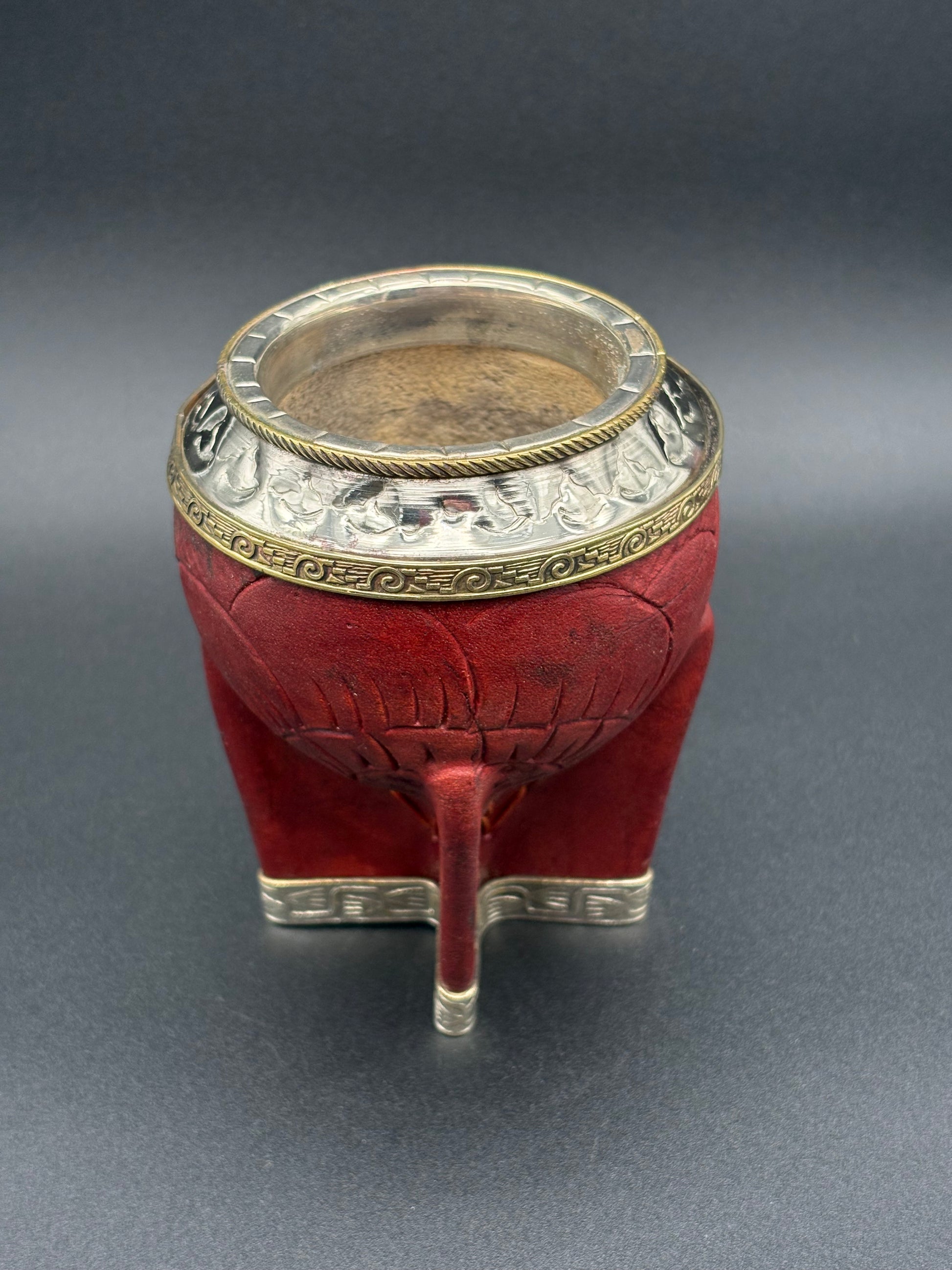 Torpedo con interior de calabaza, cuero repujado, virola de alpaca cincelada con doble aro en bronce y base de alpaca.