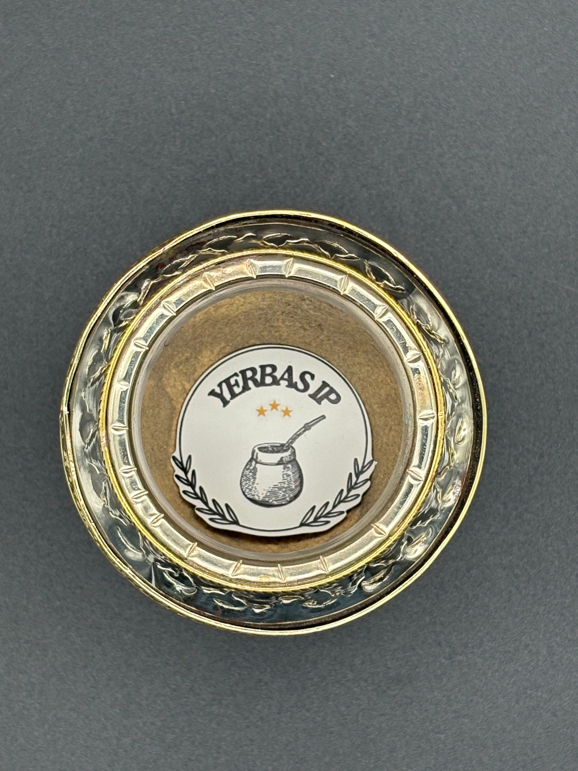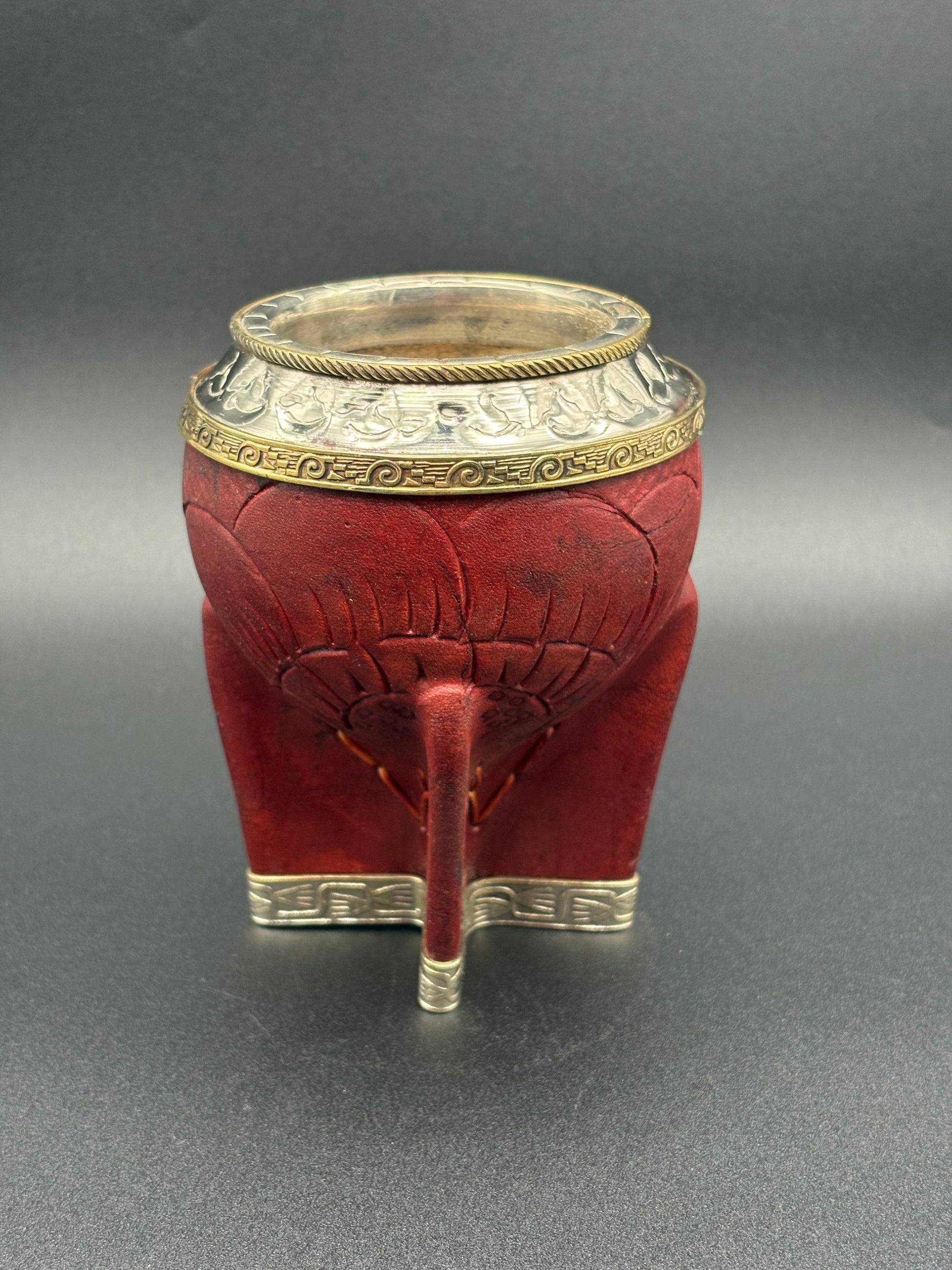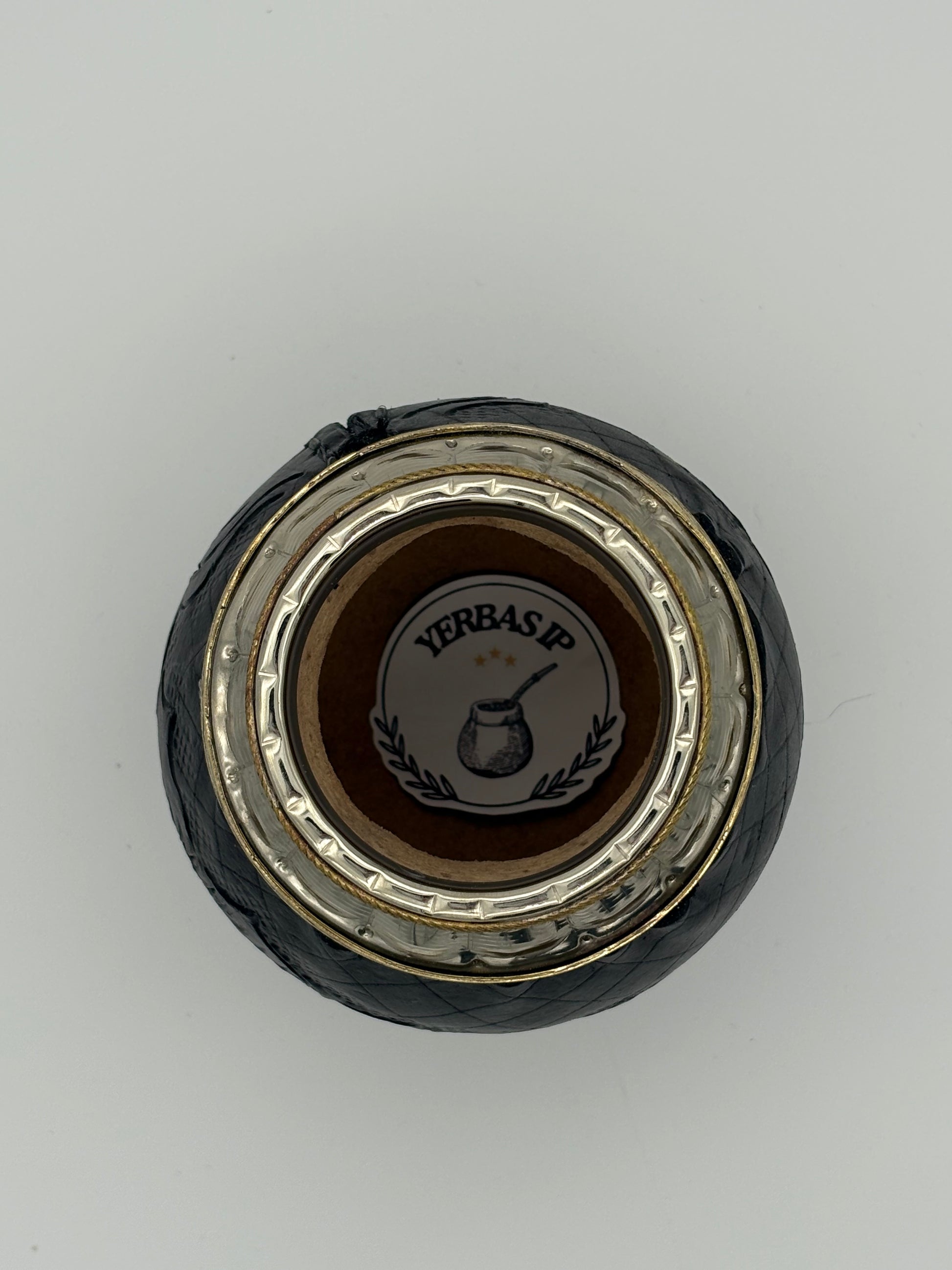 Torpedo con interior de calabaza, cuero repujado, virola de alpaca cincelada con doble aro en bronce y base de alpaca.