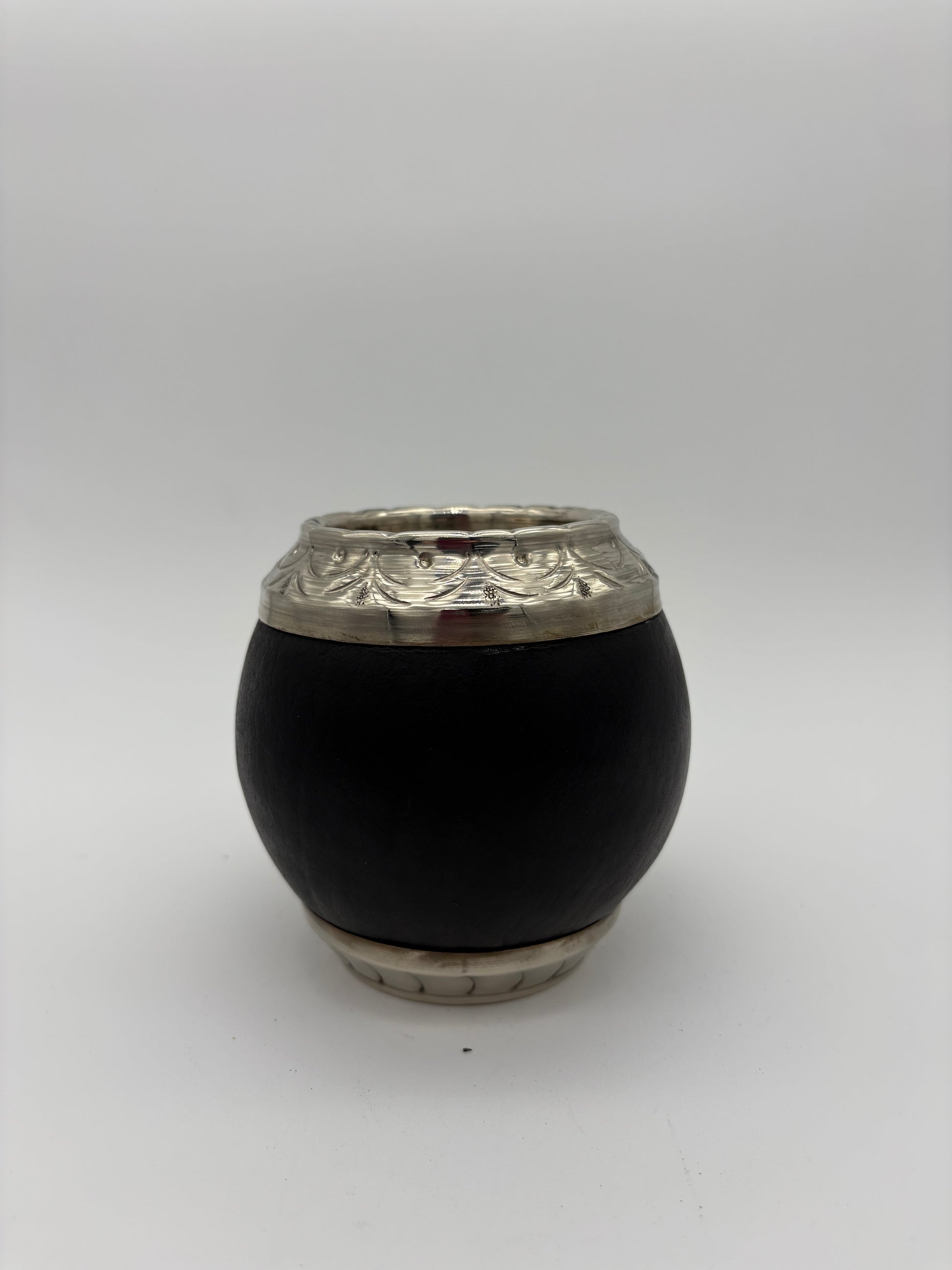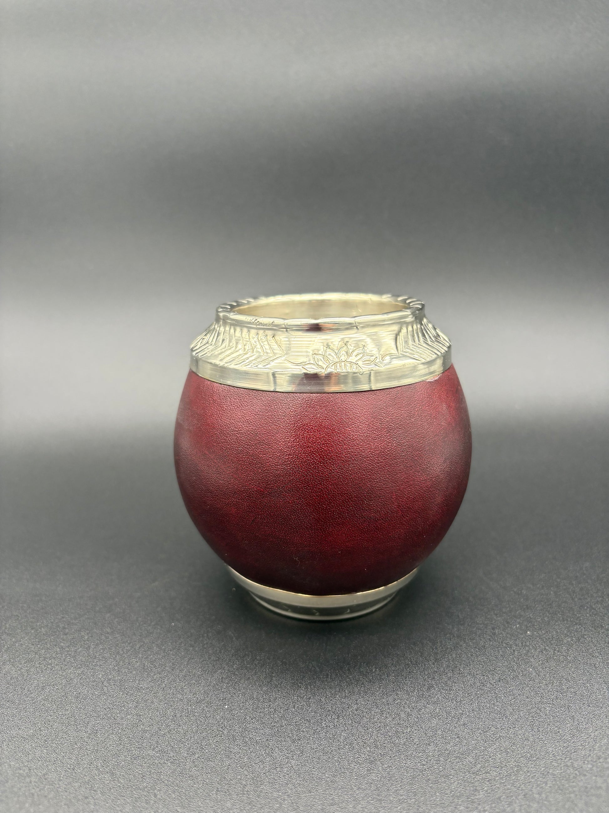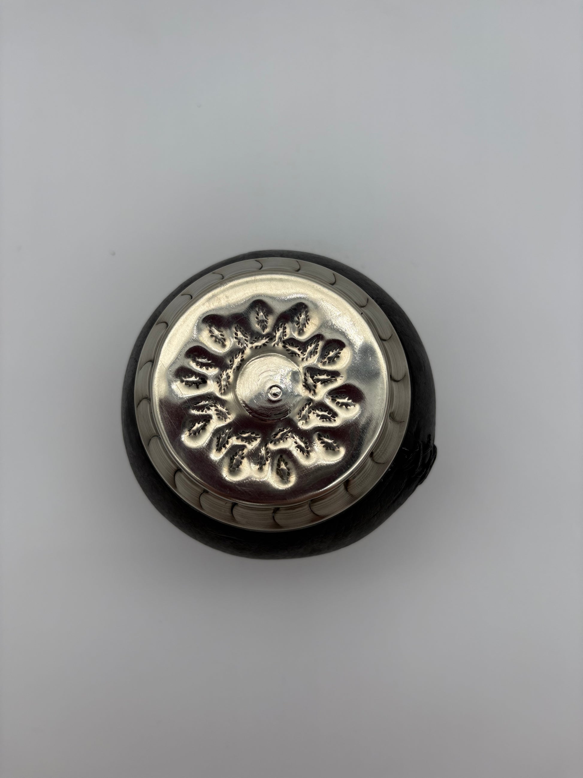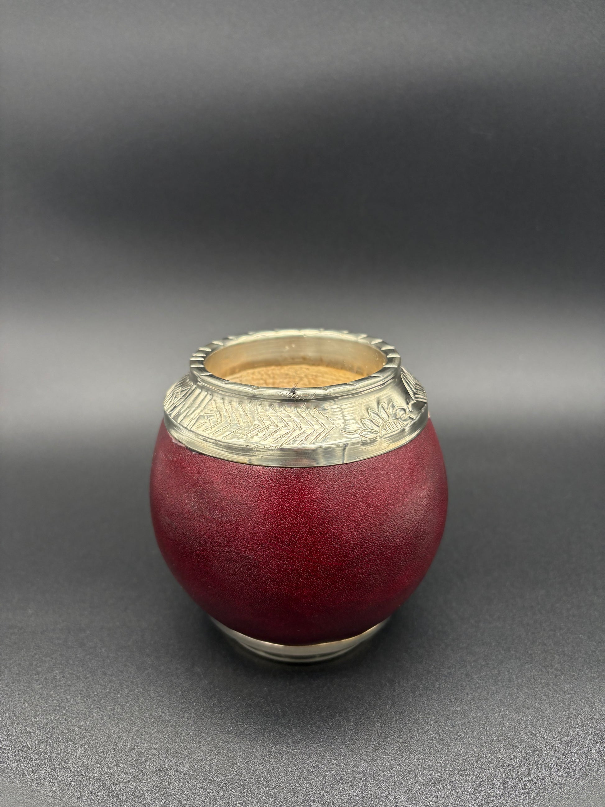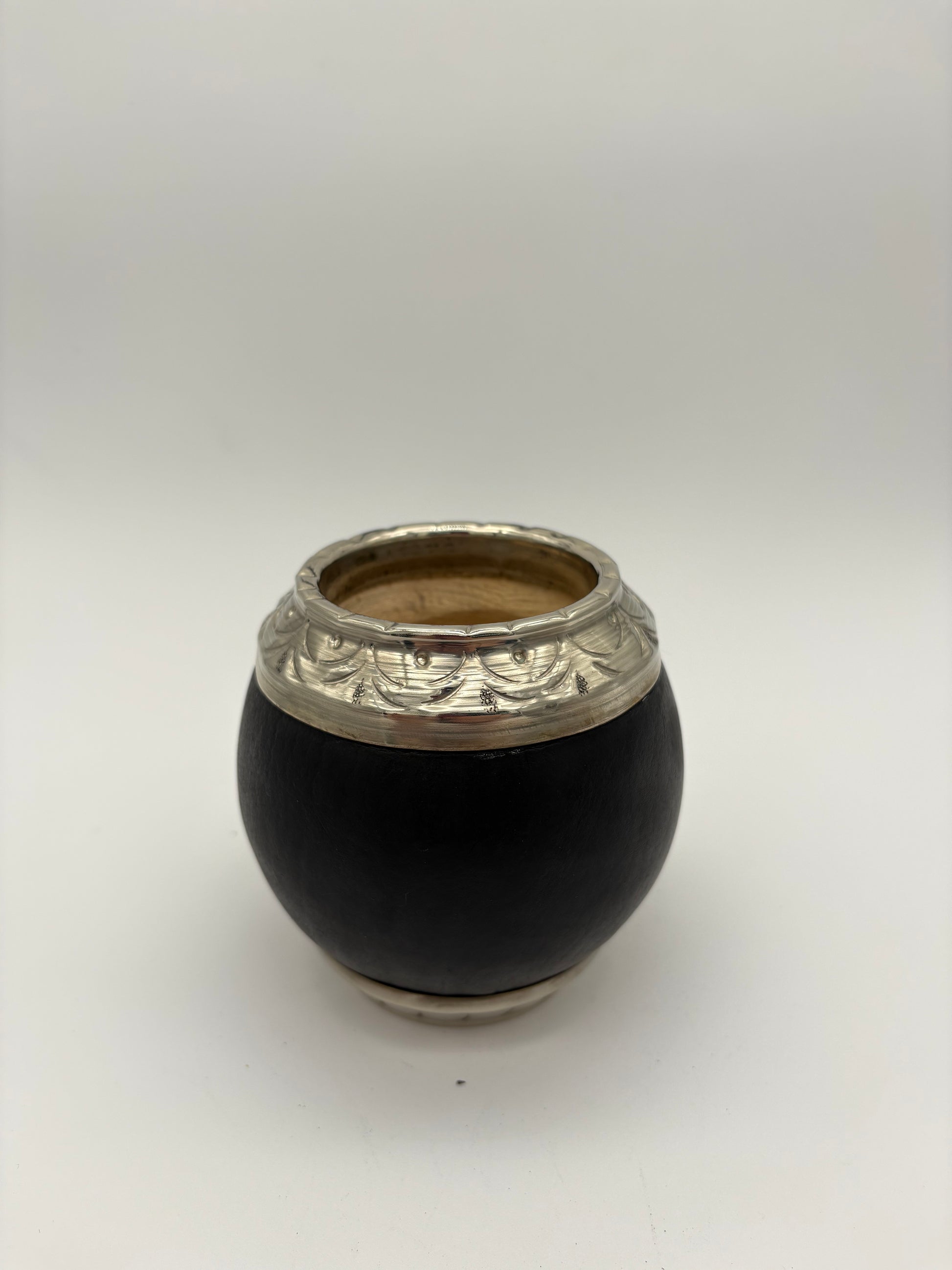 Torpedo con interior de calabaza, cuero grueso liso, virola de alpaca cincelada y base de alpaca cincelada.