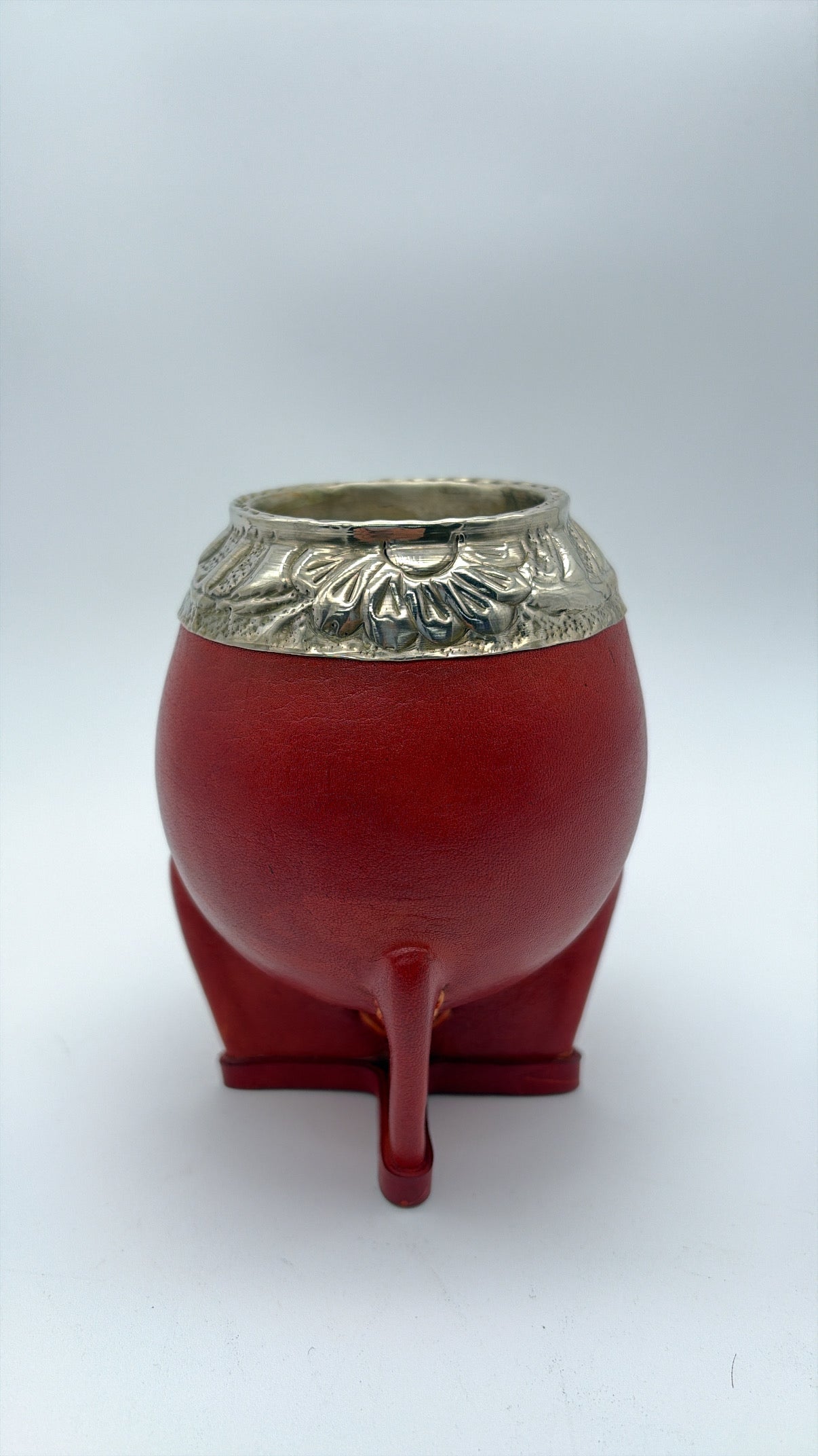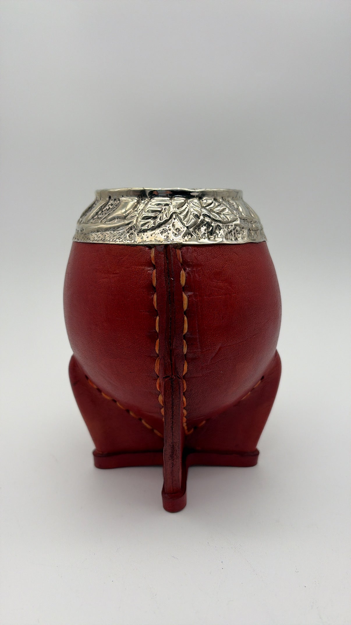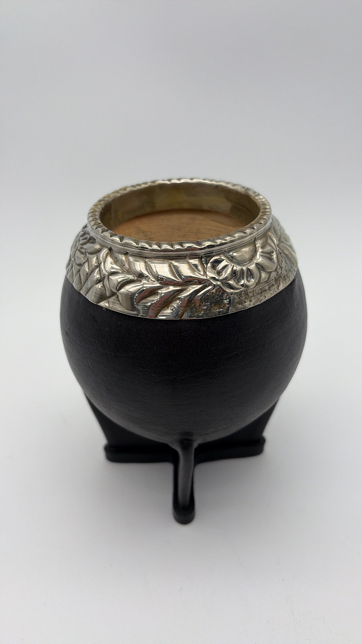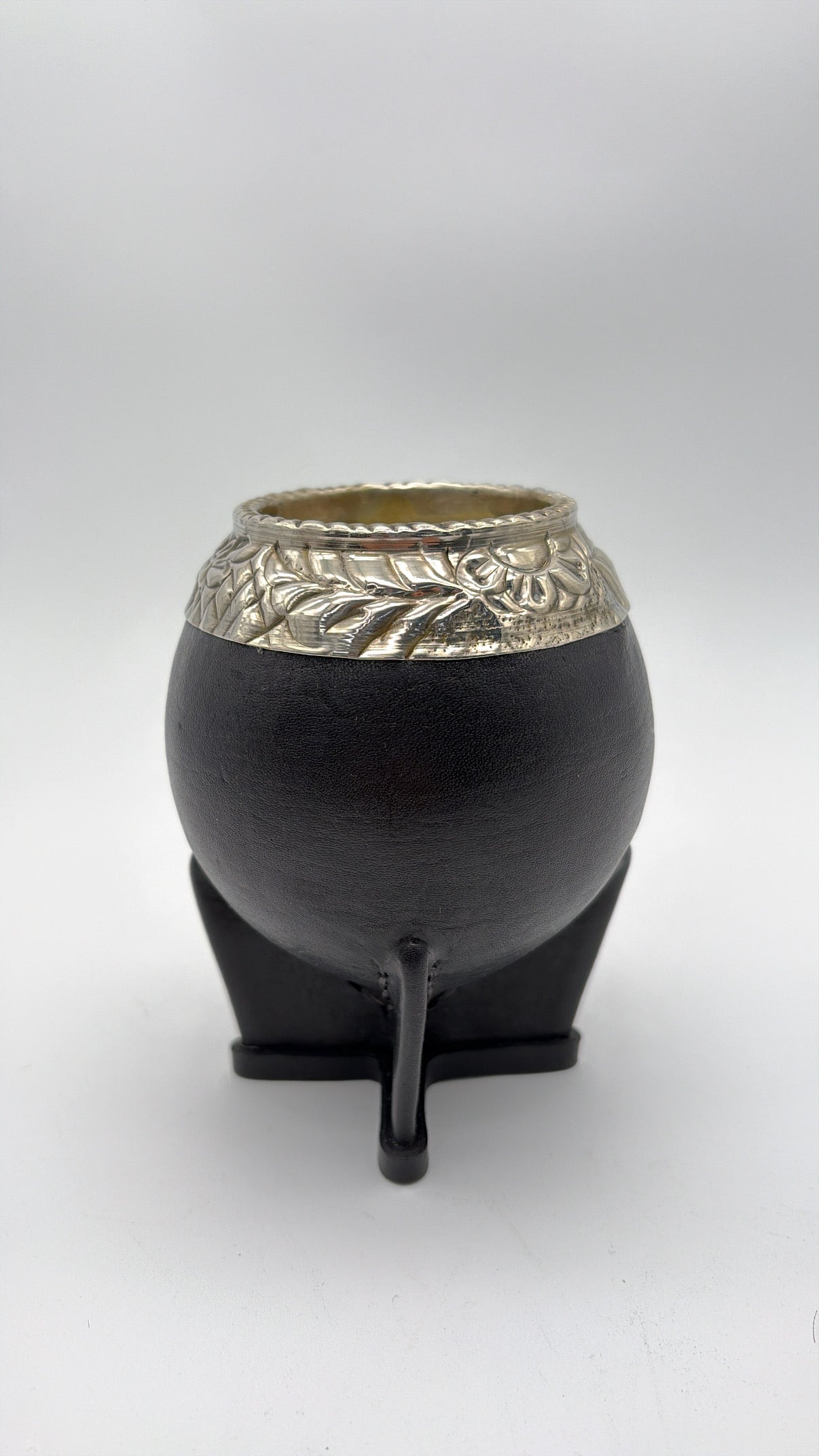 Este mate con interior de calabaza natural conserva el sabor auténtico del mate, acompañado de una virola de alpaca uruguaya cincelada al lacre, que le da un toque artesanal único.