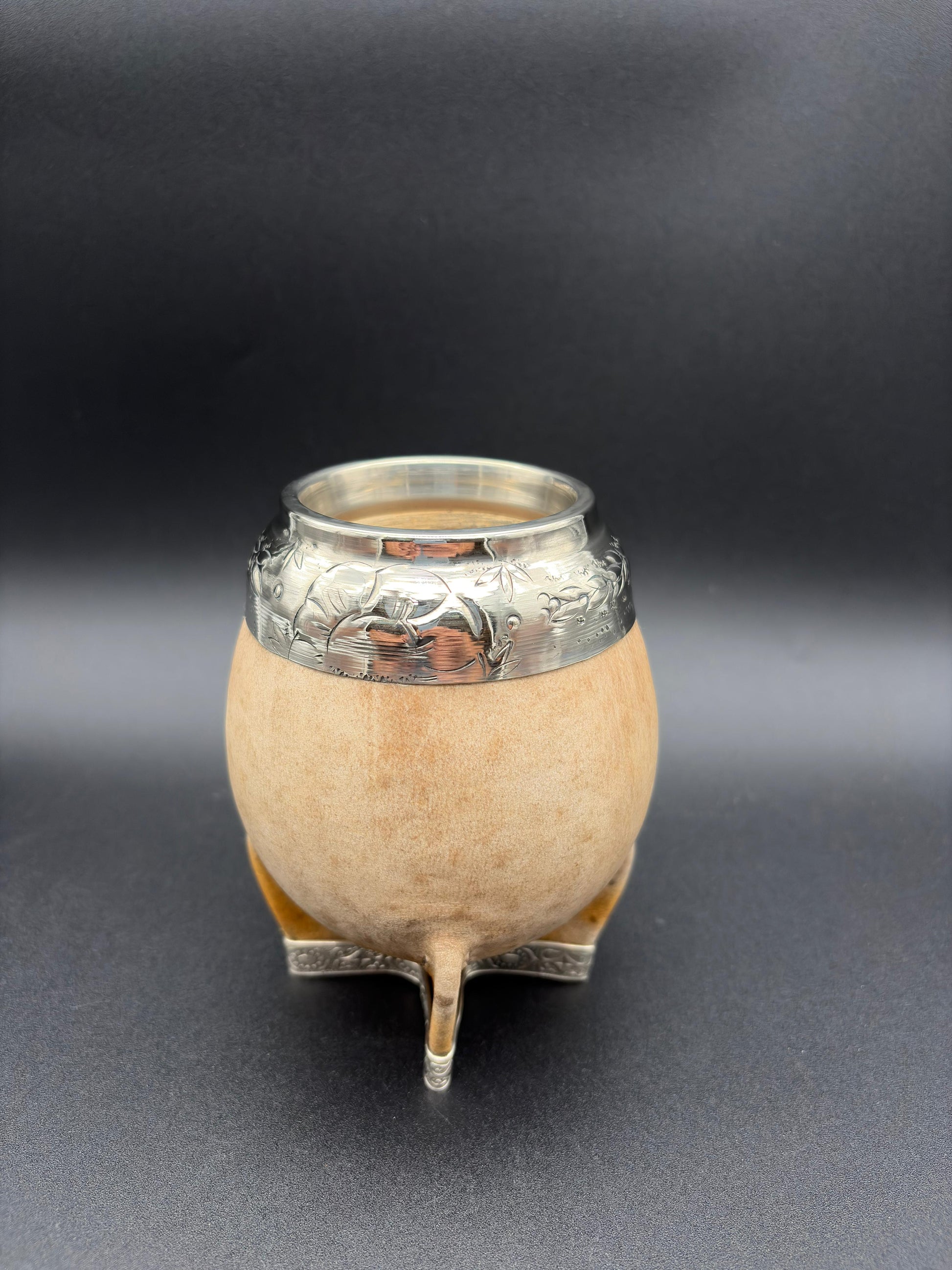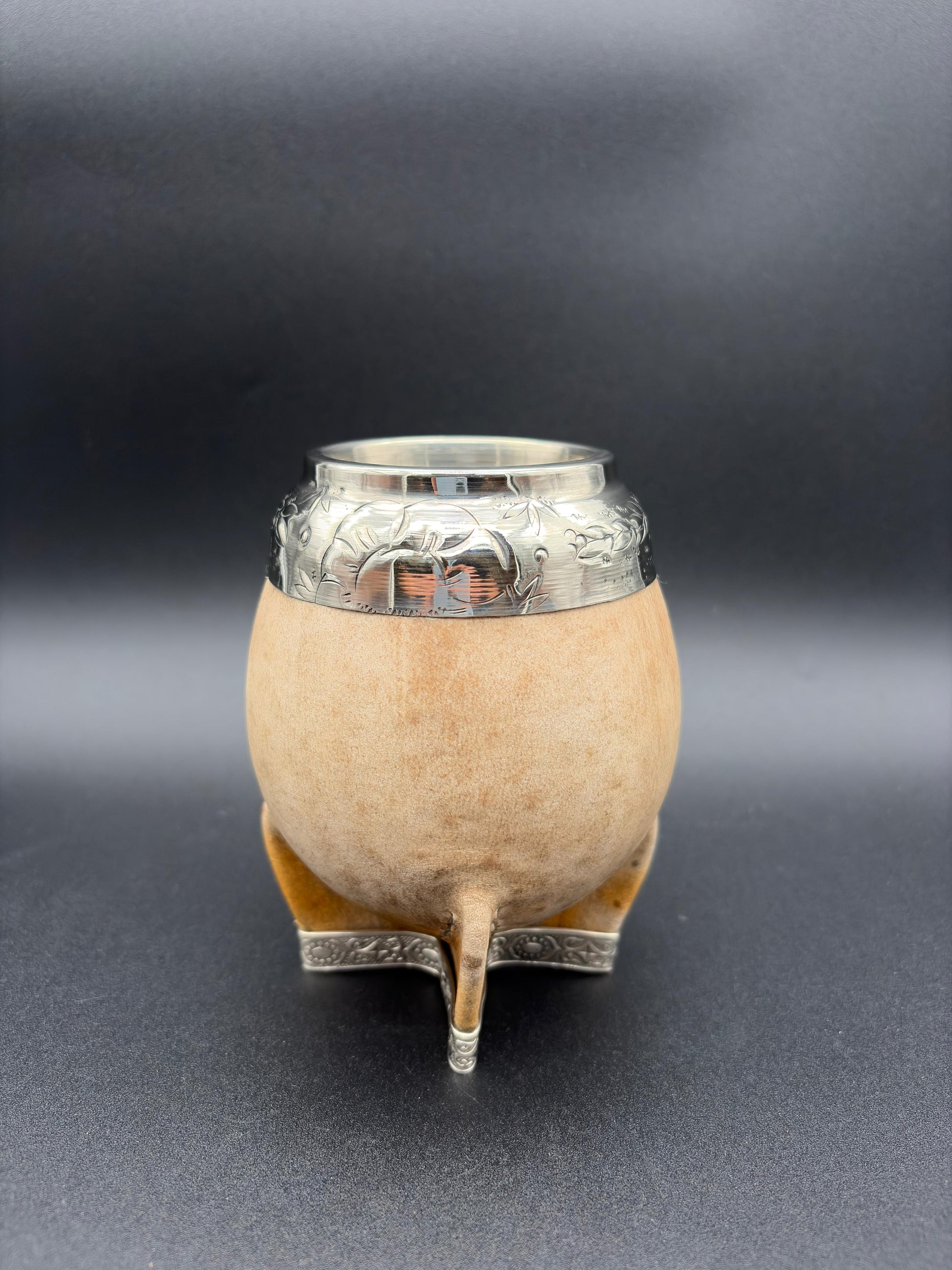 Torpedo con interior de calabaza, forrado en cuero crudo con virola de alpaca cincelada uruguaya, costuras en hilo trenzado y un refuerzo en su base de alpaca.